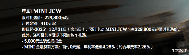 日前笔者获悉,2026款电动MINI JCW现已正式上市,官方指导价依旧为29.98万元,CLTC工况纯电续航里程468公里。而根据官方公开的信息显示,即日起至2025年12月31日(含)预订电动MINI JCW,可享限时礼遇价22.98万元。
