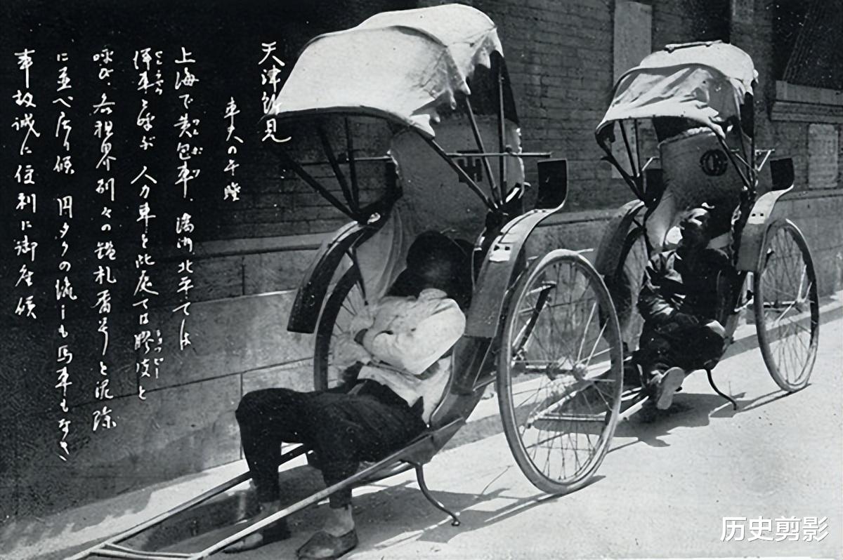 街头车夫 黄包车夫蜷在车旁打盹,烈日下的疲惫,是老天津底层的生存褶皱。
