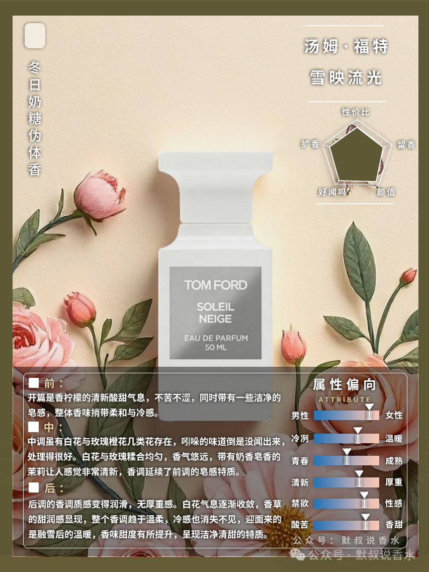 慎选:对香草甜润感、白花皂感敏感者,追求浓郁厚重东方调的人群;不推荐:讨厌清新柔和香调的人,盛夏户外长时间使用者,偏爱强侵略性香气的人群。