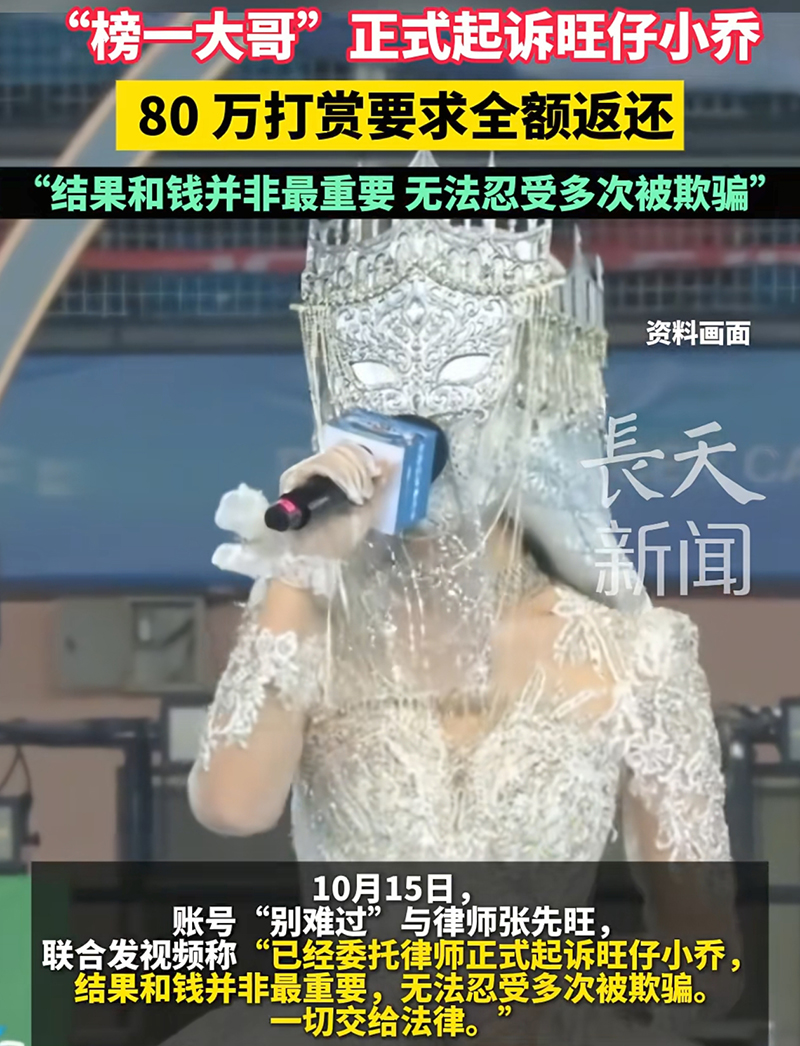 风波还未结束,旺仔小乔被榜一大哥起诉,要求返还80万打赏