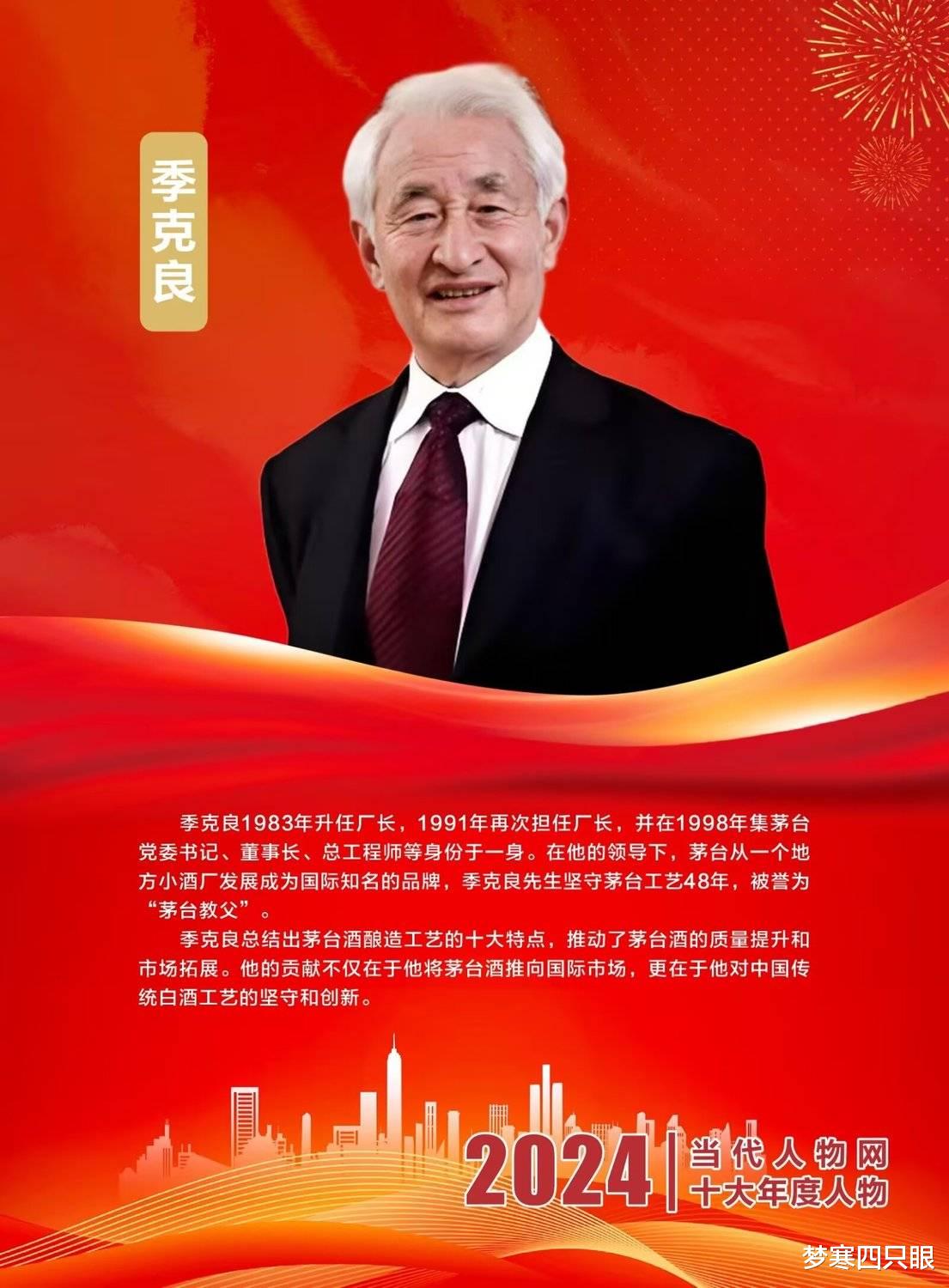 ▋颁奖词:季克良1983年升任厂长,1991年再次担任厂长,并在1998年集茅台党委书记、董事长、总工程师等身份于一身。在他的领导下,茅台从一个地方小酒厂发展成为国际知名的品牌,季克良先生坚守茅台工艺48年,被誉为“茅台教父”。