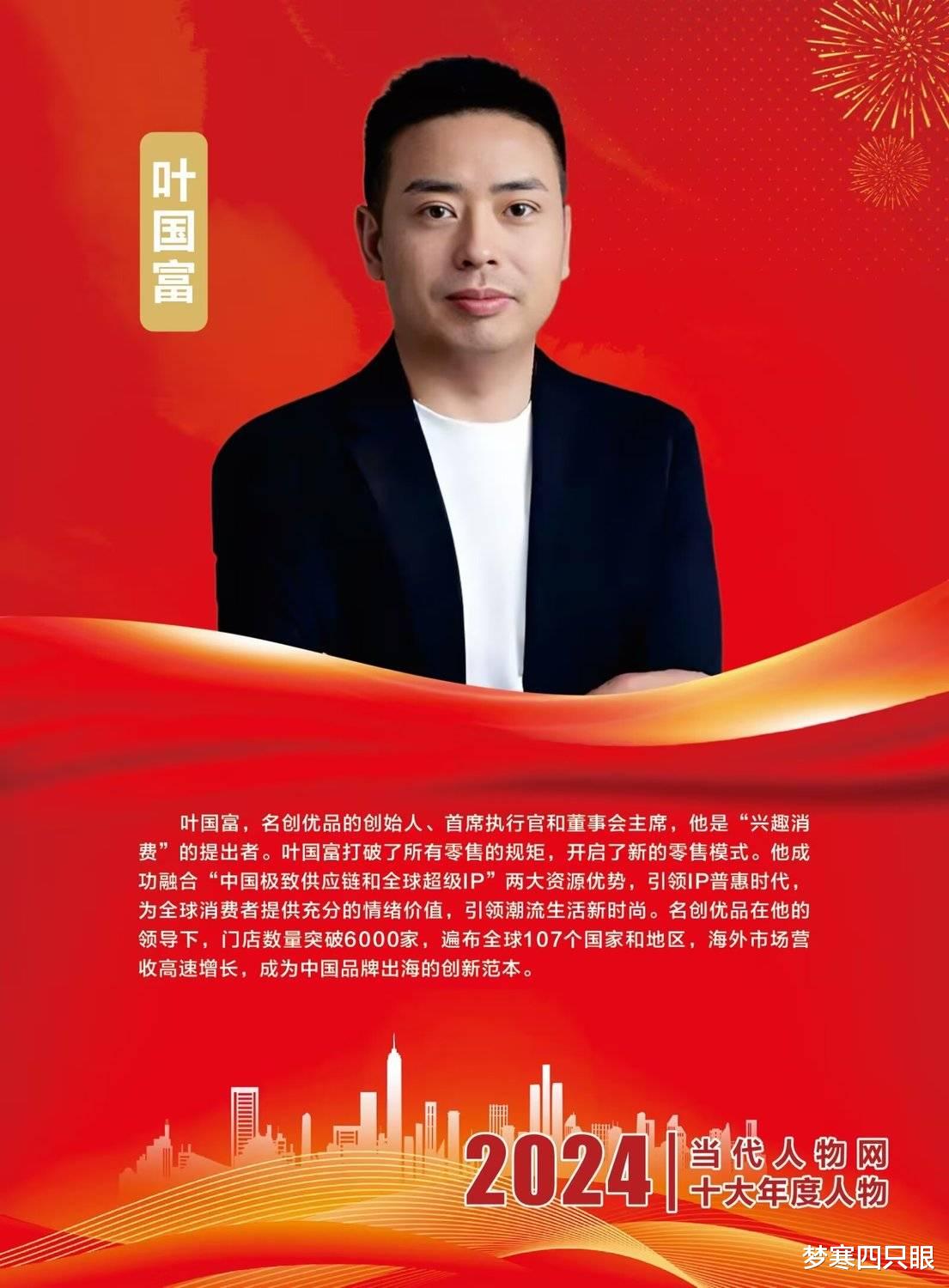 ▋颁奖词:叶国富,名创优品的创始人、首席执行官和董事会主席,他是“兴趣消费”的提出者。叶国富打破了所有零售的规矩,开启了新的零售模式。他成功融合“中国极致供应链和全球超级IP”两大资源优势,引领IP普惠时代,为全球消费者提供充分的情绪价值,引领潮流生活新时尚。名创优品在他的领导下,门店数量突破6000家,遍布全球107个国家和地区,海外市场营收高速增长,成为中国品牌出海的创新范本。
