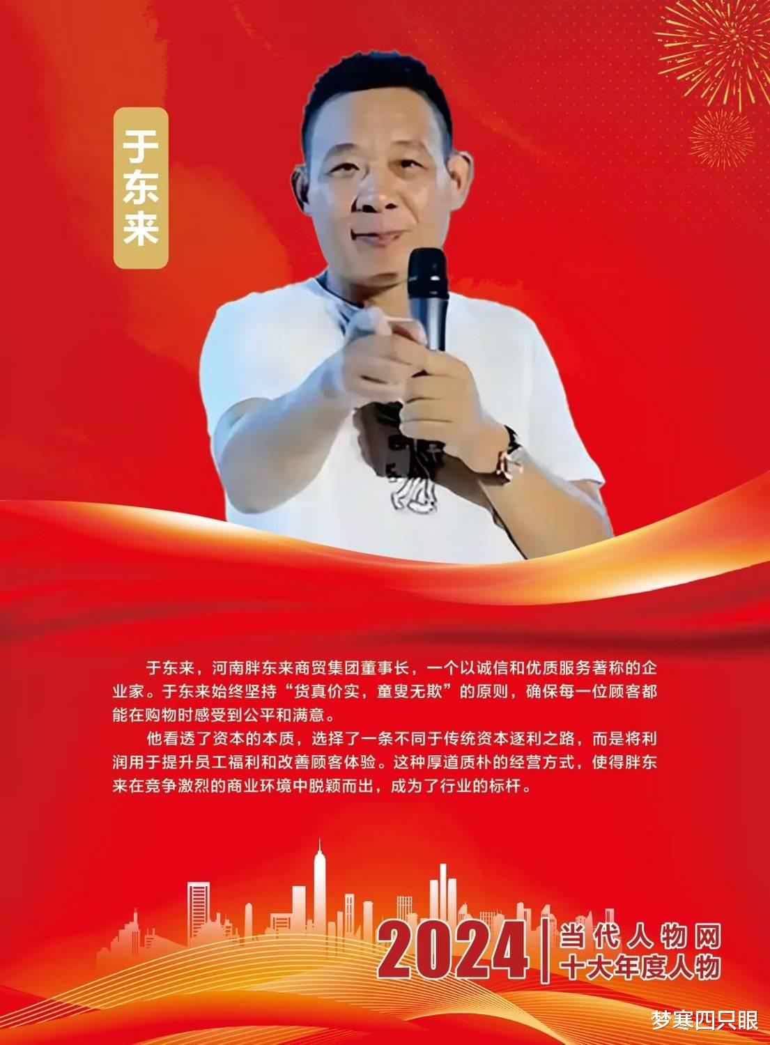 ▋颁奖词:于东来,河南胖东来商贸集团董事长,一个以诚信和优质服务著称的企业家。于东来始终坚持“货真价实,童叟无欺”的原则,确保每一位顾客都能在购物时感受到公平和满意。