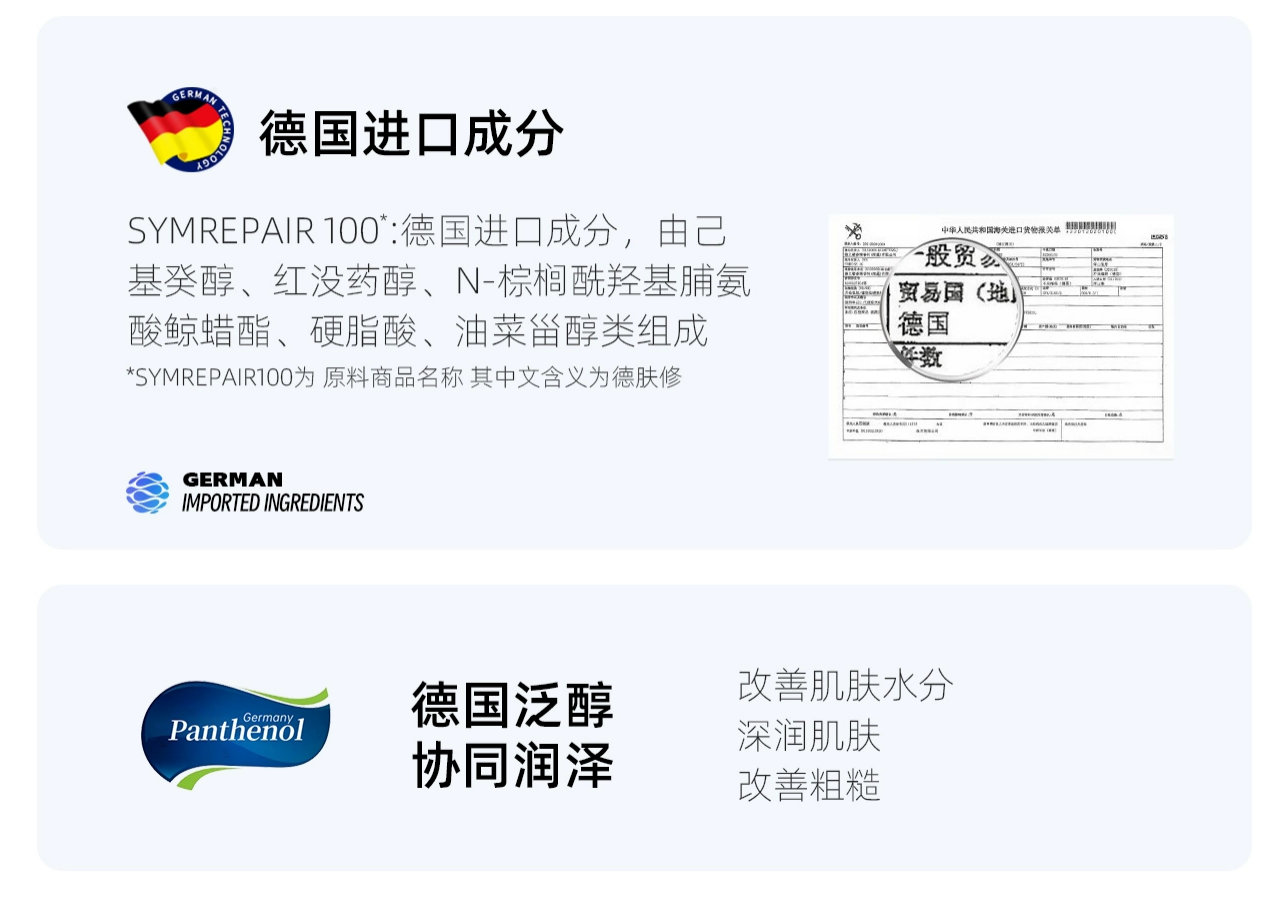 2.德国进口核心成分:SYMREPAIR 100®+ 泛醇,修护保湿双在线