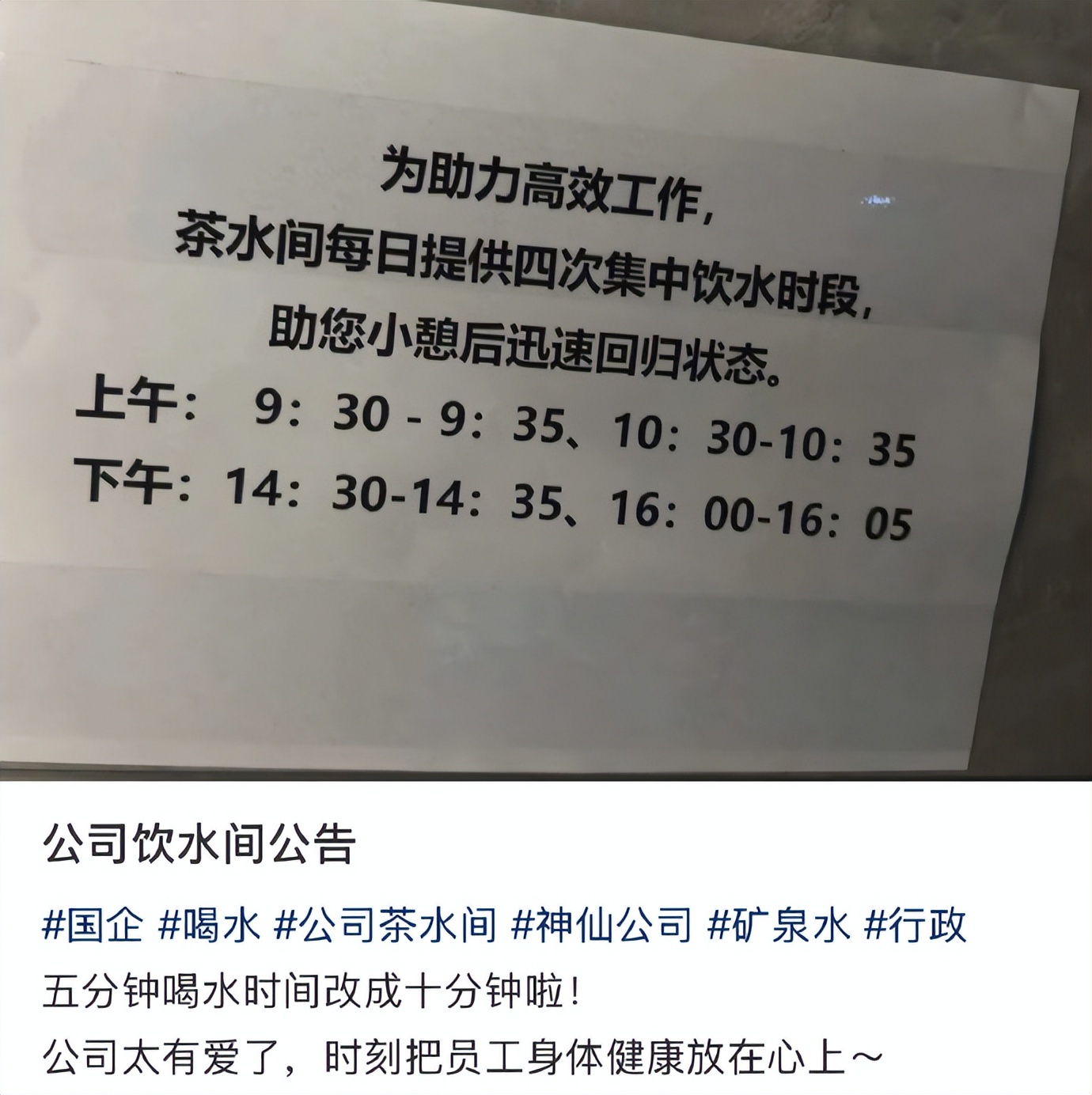10月16日,“一时分不清是茶水间还是牛马槽”话题冲上热搜,有网友上传了一张茶水间公告的图片,图片内容显示,公司规定每天四次集中饮水时段,上午下午各两次,每次5分钟。