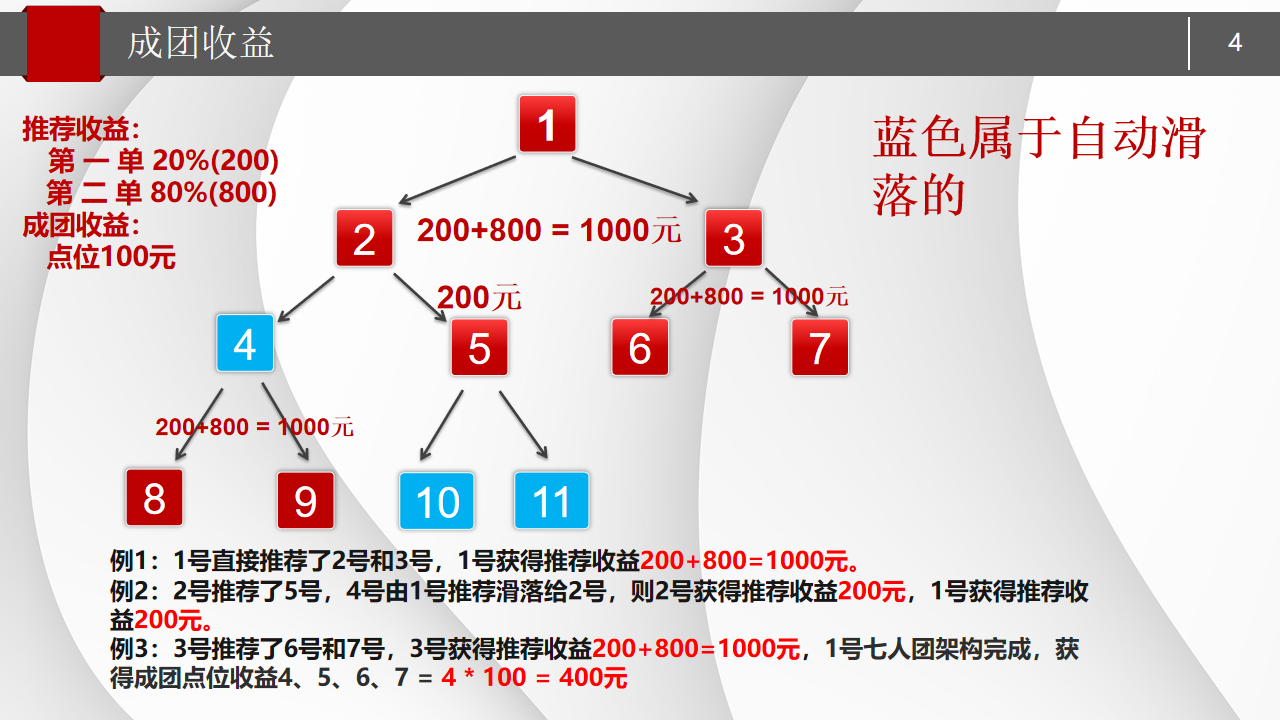 • 升级后的团长,不仅能长期享受 279 模式的 “永久分虹”,还能同步参与推三返一模式的 “伯乐奖”,即直推团队收易的 100%;