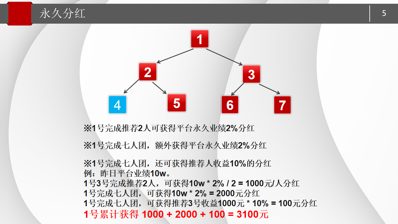 • 当 VIP 推荐满 2 人,系统自动为她成立 “健康小组”,从此她能享受平台总业绩 2% 的平均分虹;