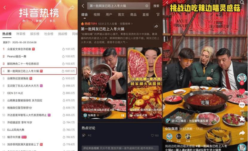 而“火锅夜猫团·百人测评”活动,则通过打造“百人团”,组织百位火锅老吃家组团挑战高吃商火锅吃法,将“吃火锅”变成一种可参与的潮流趋势。热点话题“吃商极高的人开始续火锅了”已突破2500万次播放,话题底下,博主们在不同火锅品牌店解锁火锅的新鲜吃法,“涮百香果牛肉”“海带酿虾滑”“甲鱼裙边煮火锅”等创新吃法层出不穷,直接拉高了消费热度。