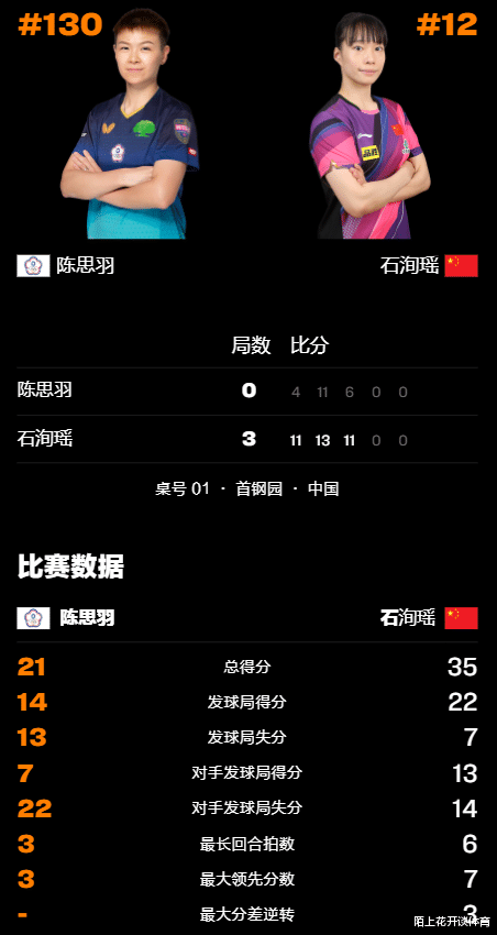 首局比赛开打之后,石洵瑶进入状态非常快,而且也打得简单明了,就是发球抢攻,用长球去冲击陈思羽的防守,高质量的出手取得了预期的效果,一上来就连得6分,打出了气势,尽管陈思羽靠着反手劈大对角,衔接正手爆冲连追了2分,但石洵瑶很快就夺回了主动权,再次拉开比分,轻松以11-4取得了开门红。