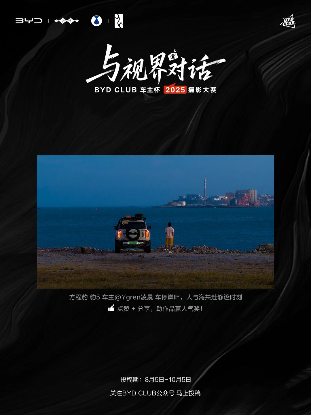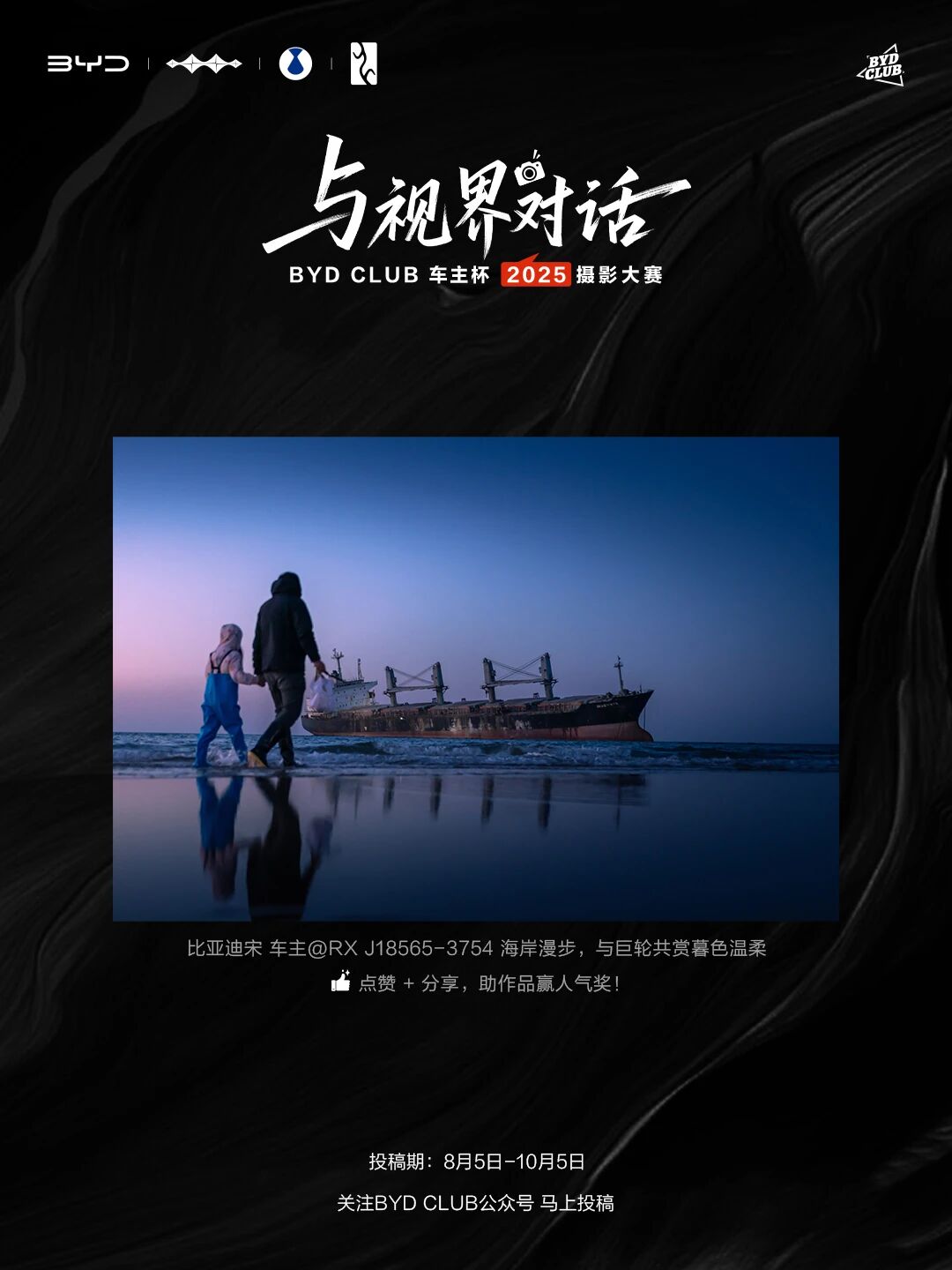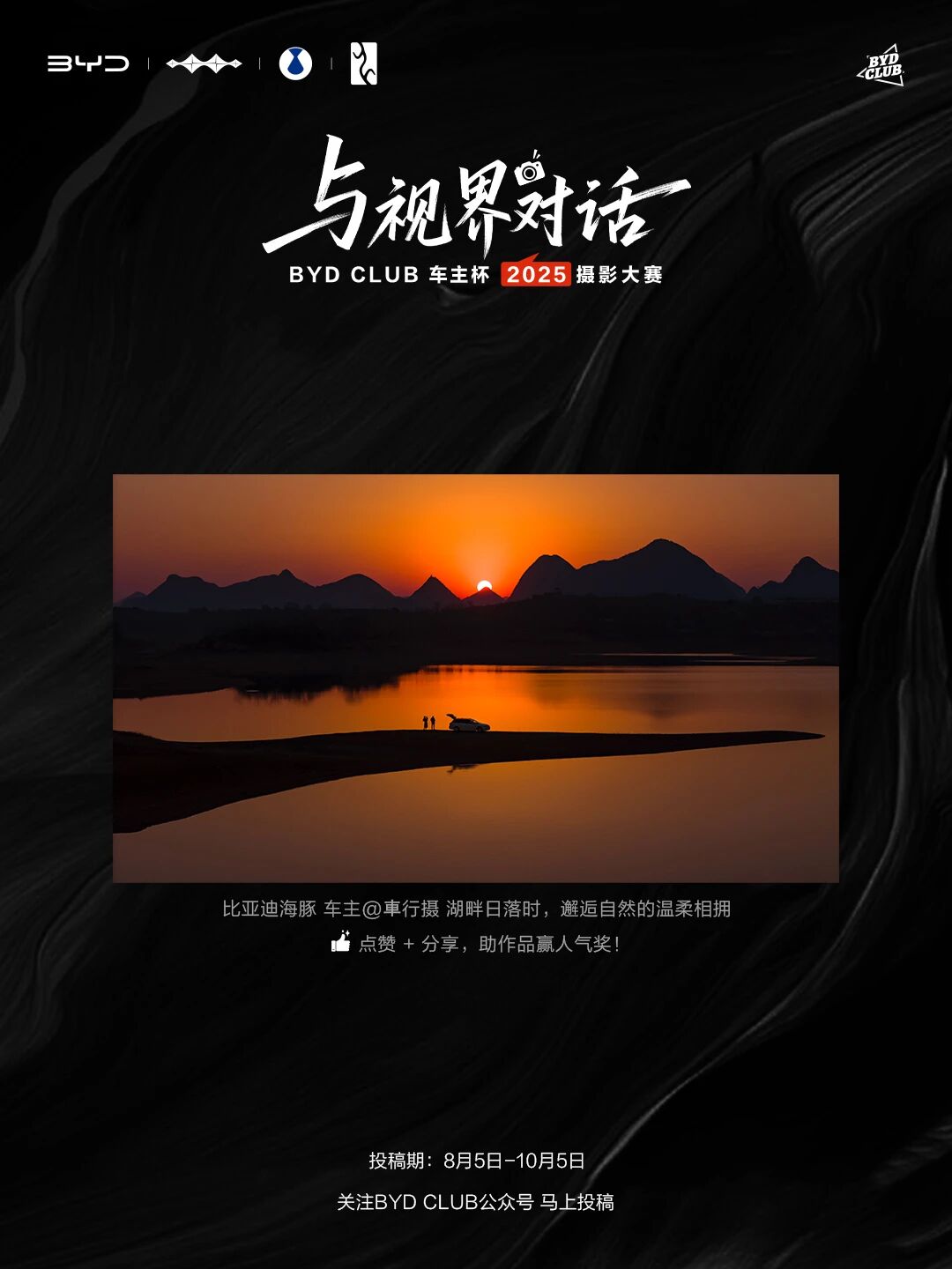 比亚迪车主杯摄影大赛火热开赛啦!夕阳下的车影、接娃的笑脸、郊游时的光影瞬间,个个都像电影画面,是车主们在路上捕捉生活里的小确幸!摄影的意义就是“定格美好”,让每张照片都带着故事和温度。现在已经到中期,投稿热度爆棚!还有20天,车主们快抓紧时间,拿起手机或相机,拍下你和爱车的日常,上传到BYD CLUB平台。奖品超给力,DJI Pocket 3等着你!就算不是车主,也能感受到比亚迪的这份生活态度。快去围观,点赞那些超美瞬间,或者喊上开比亚迪的朋友一起参赛,秀出属于你们的风景!