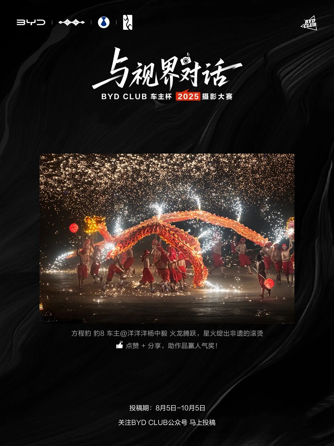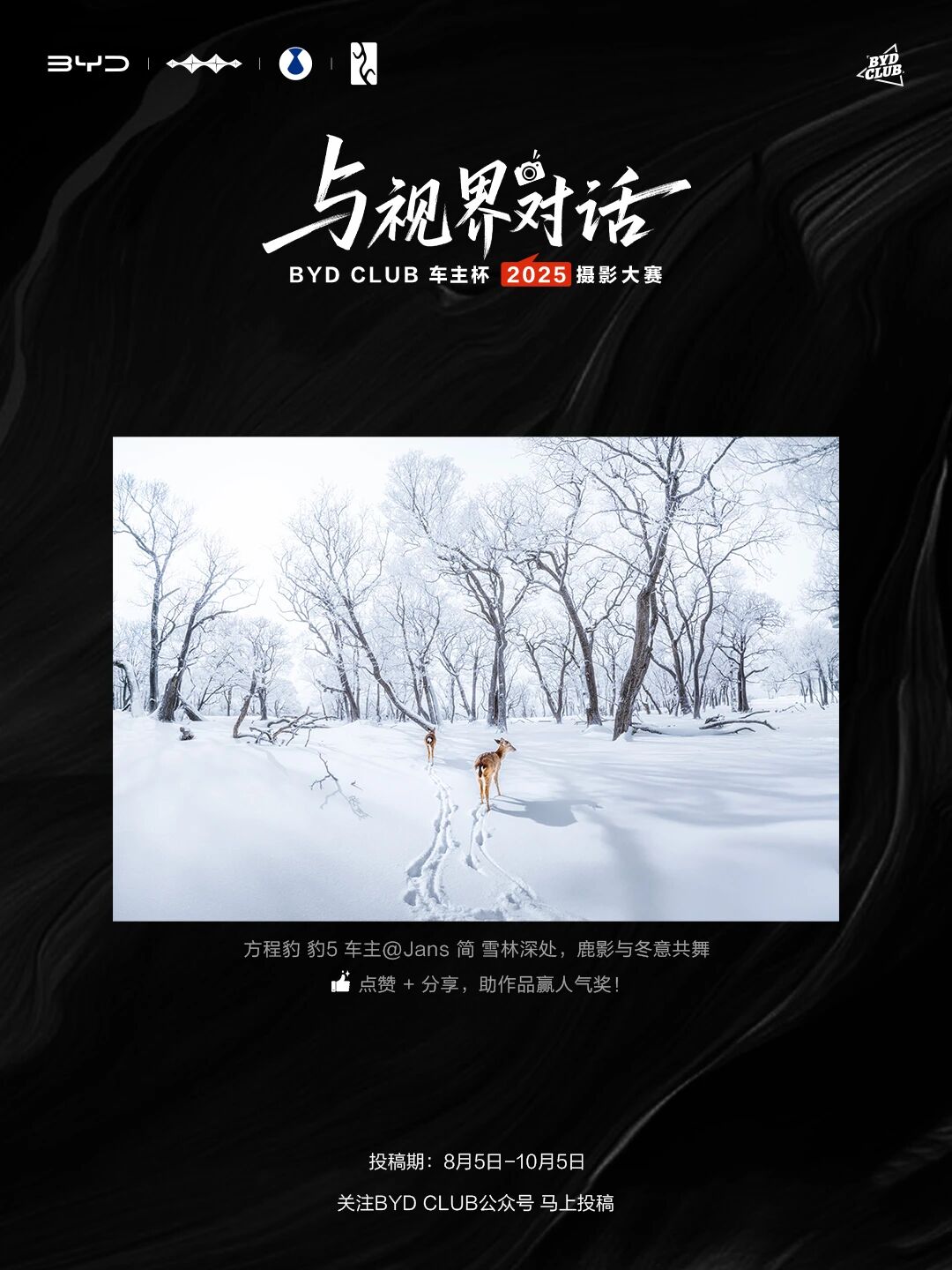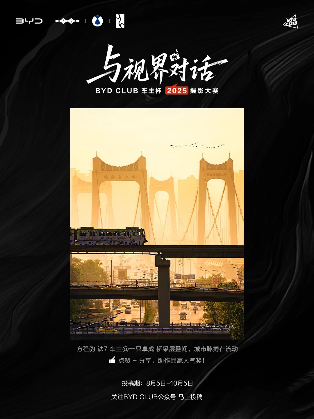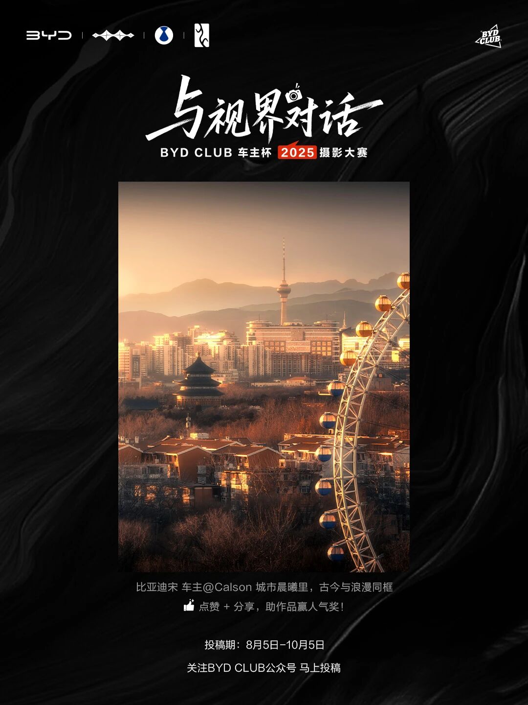 比亚迪车主杯摄影大赛火热开赛啦!夕阳下的车影、接娃的笑脸、郊游时的光影瞬间,个个都像电影画面,是车主们在路上捕捉生活里的小确幸!摄影的意义就是“定格美好”,让每张照片都带着故事和温度。现在已经到中期,投稿热度爆棚!还有20天,车主们快抓紧时间,拿起手机或相机,拍下你和爱车的日常,上传到BYD CLUB平台。奖品超给力,DJI Pocket 3等着你!就算不是车主,也能感受到比亚迪的这份生活态度。快去围观,点赞那些超美瞬间,或者喊上开比亚迪的朋友一起参赛,秀出属于你们的风景!