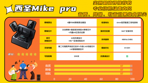 为打造发烧级性能体验,西圣Mike Pro去除多余功能和型号,专注一款产品死磕多年,历经数十次升级,优化200多个性能细节,在音质、连接、耐用和可靠性上远超竞品友商!它独创10大黑科技,包括全指向AI感知麦克风、第二代ALPT高密度拾音技术、AI抗风噪设计等,收音效果和稳定性达旗舰级水准,声音清晰度98%、抗噪性96%。和大疆、罗德等高端系列麦克风的影响力齐名。出口欧美市场多年,被媒体誉为行业最强收音性能,唯一获欧盟等多国认证,罕见荣获多家知名媒体推荐。