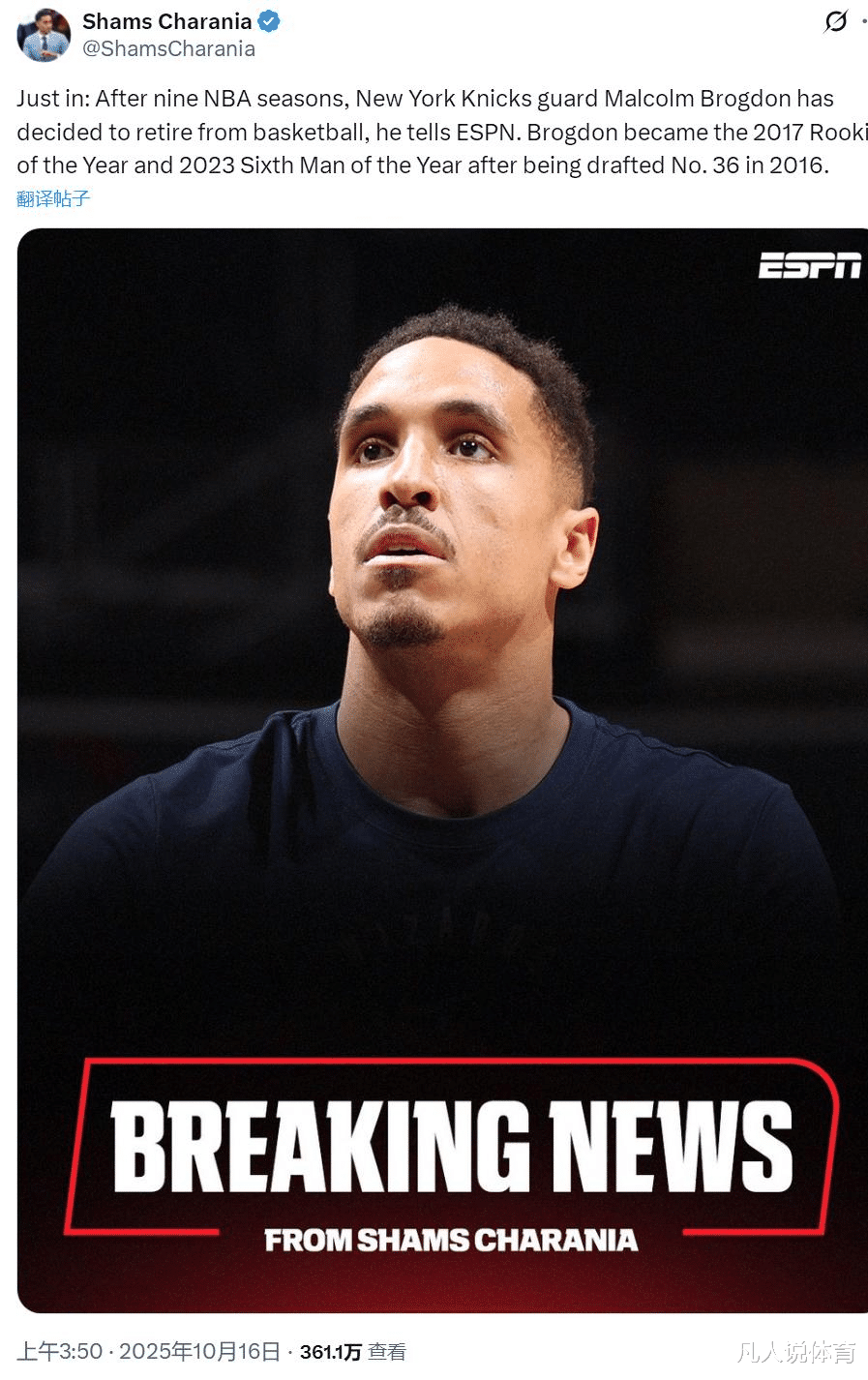 北京时间 10 月 16 日,NBA 联盟传来一则令人震惊的消息 ——32 岁的控卫马尔科姆 - 布罗格登通过 ESPN 发布声明,正式宣布退役。这位曾经的最佳新秀和最佳第六人得主,在职业生涯的黄金时期突然选择结束自己的篮球生涯,让整个联盟都感到意外。据悉,布罗格登此前就一直在考虑退役事宜,而他也是纽约尼克斯队除核心后卫杰伦 - 布伦森外,唯一一位纯正的控卫人选。
