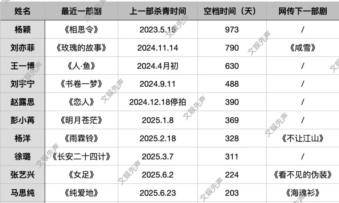 其中,除了彭小苒、徐璐等上升期演员,绝大多数都是大众认知内“戏约永远排满”的顶流。尤其是排名前三位的杨颖、刘亦菲与王一博,空窗期均以“年”为单位计算,前两位甚至已超过两年。