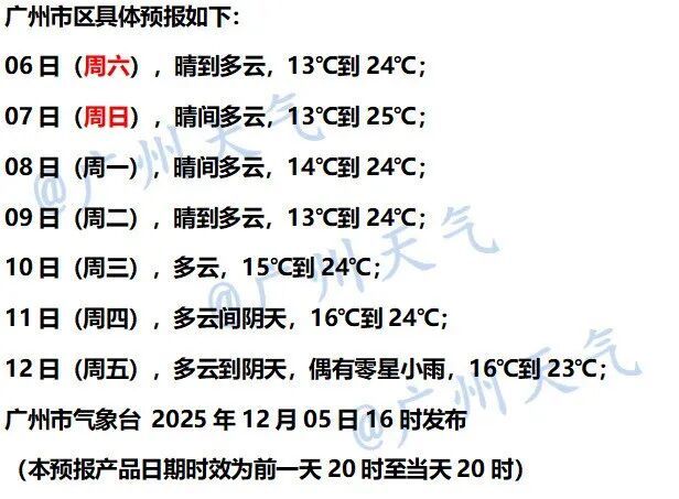 广州市气象台预计,12月6日—8日广州以晴朗干燥天气为主,最低气温13℃~14℃,最高气温224ssd~25℃。12月12日开始,受冷空气影响,有小雨,气温明显下降。
