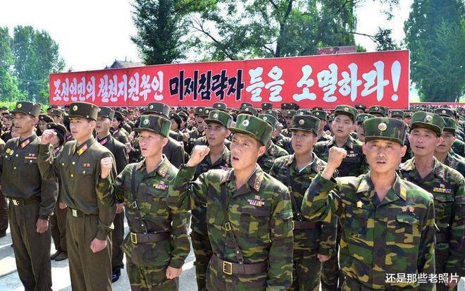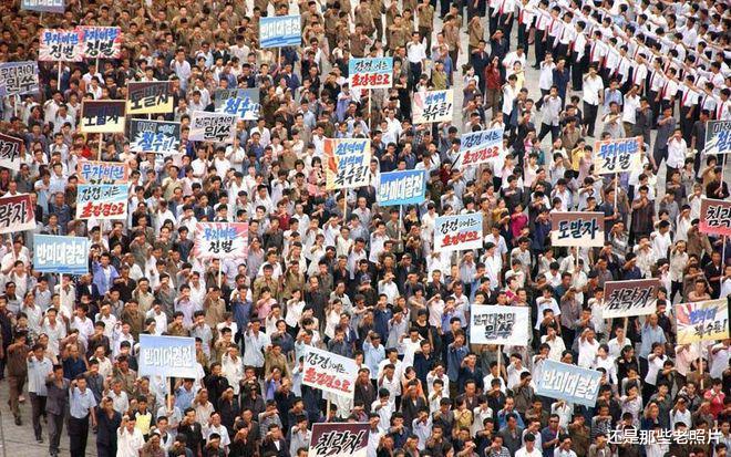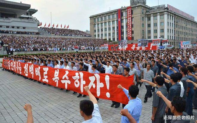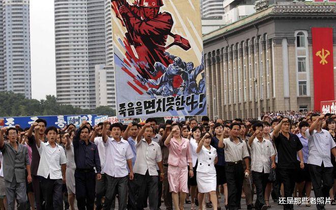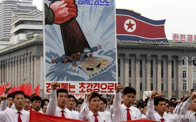金日成广场上愤怒的平壤老百姓,挥舞着拳头。后面是一幅宣传画,画中是被朝鲜人民打倒在地的美国鬼子。
