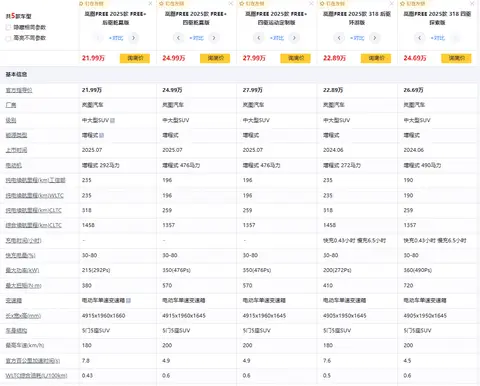 岚图FREE(品技术)+此次推出了多个不同配置的版本,价格跨度不算大,覆盖了不同需求的用户群体。2025款后驱乾崑版定价21.99万,纯电续航318km,对于主要在市区代步的家庭用户来说,是个不错的选择。2025款四驱乾崑版售价24.99万,采用双电机四驱,纯电续航259km,追求动力和通过性的用户可以考虑。而2025款四驱运动定制版售价27.99万,外观内饰有升级,座椅采用NAPPA真皮,适合对外观和内饰质感有较高要求的用户。(具体详情请咨询当地经销商)