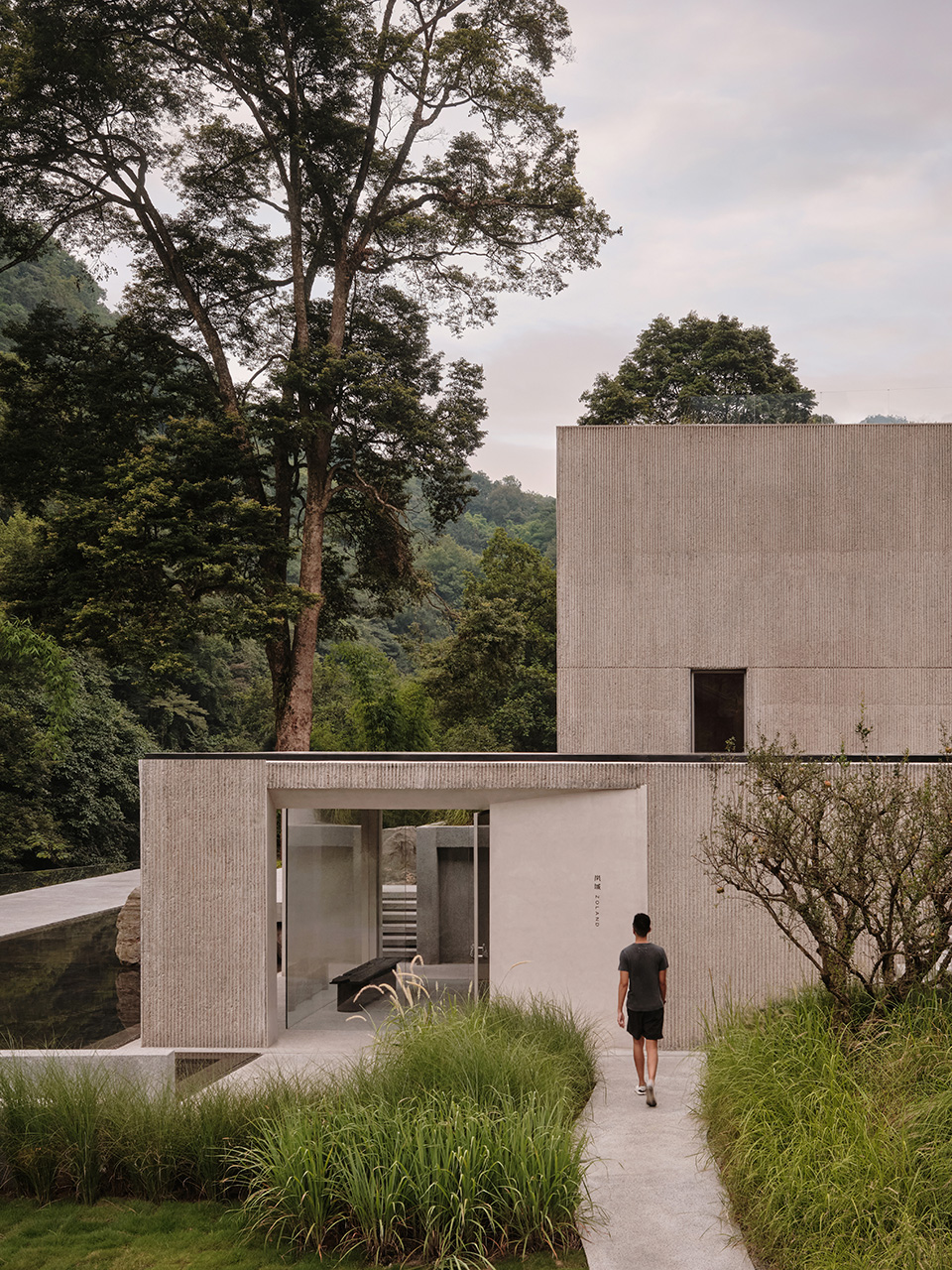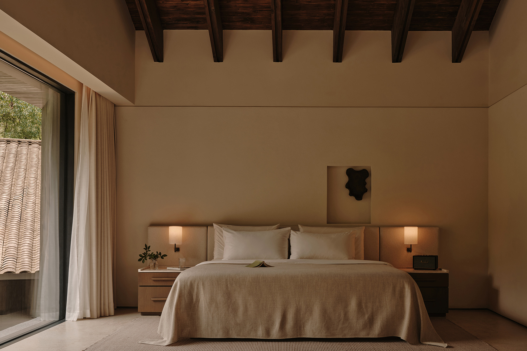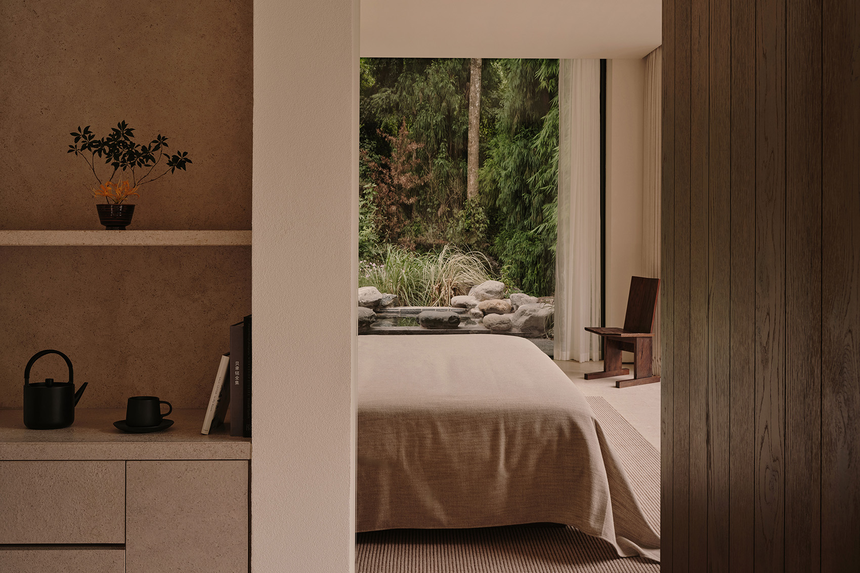 场地最高点的客房设计时,整面落地窗将宁静山峦尽收眼底,框景于山,如同一幅展开的山水画,营造出沉浸的观景体验。浴室采用当地红砂岩,厚重而质朴的质感延续着土地的气息。天然的肌理与克制的色调,又将空间转化为山中一隅宁静的栖居之所。