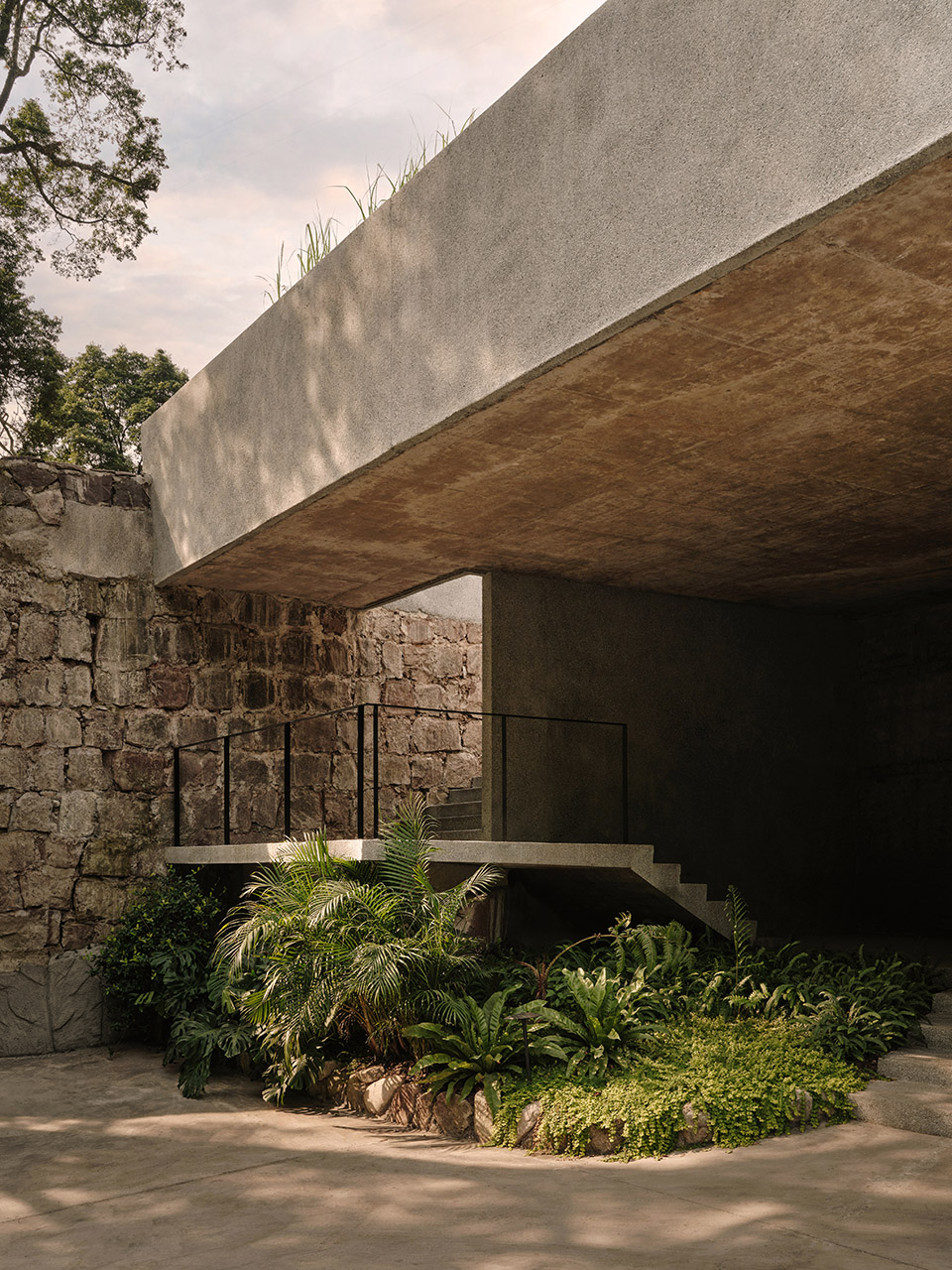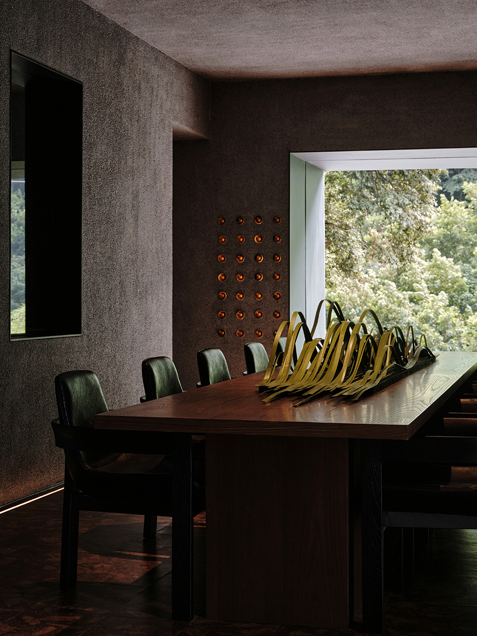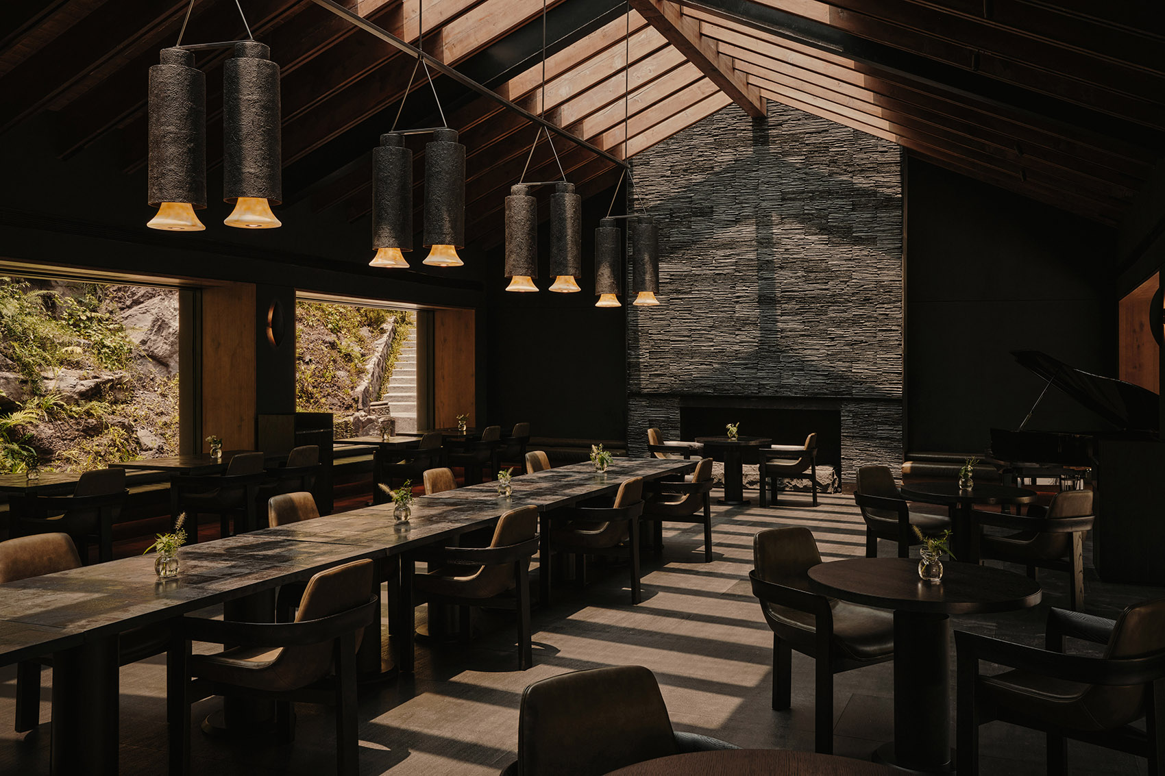 餐厅设计将传统建造技艺与严谨的结构逻辑相融合。屋顶采用了乐山夹江传统青瓦,室内天花由雪松木梁横跨支撑,营造出温润且有节奏的空间氛围。墙面选用采自峨眉山的片岩,凸显建筑的在地性,使室内与周边的山林景观相呼应。