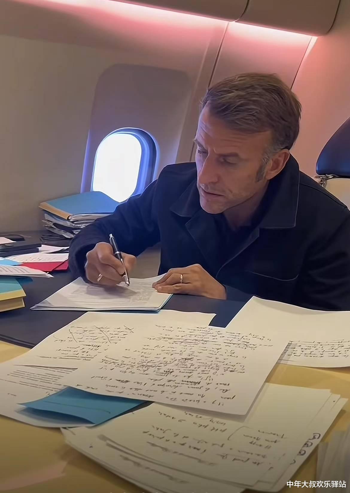 无独有偶,几个月前,法国总统也有一张照片,照片显示他在总统专机上,也是专心致志地伏案计算。