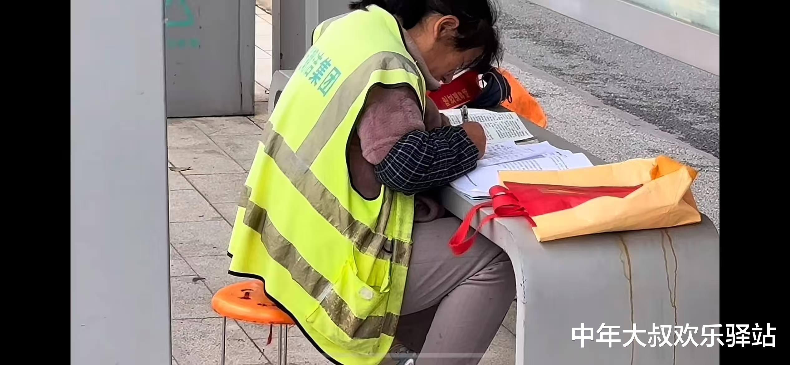 这两天短视频平台和我的朋友圈被这样一张图片刷屏了:一位环卫工女士,把公交站台的座椅当作桌台,伏案学习,专心致志地写些什么