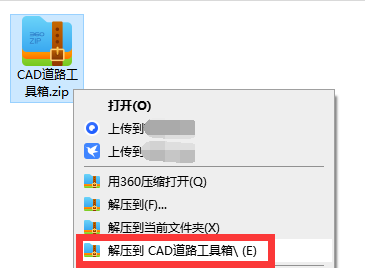 加载步骤:1、得到压缩包之后,鼠标右键解压,点击【解压到CAD道路工具箱】。