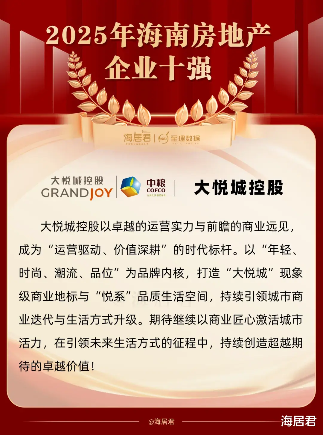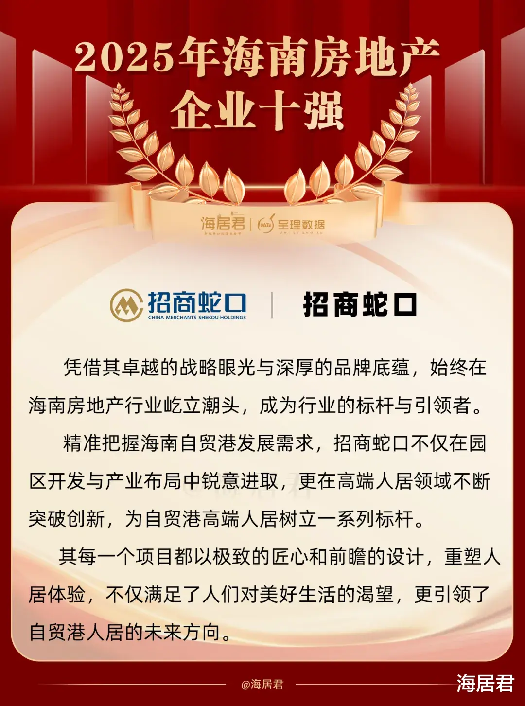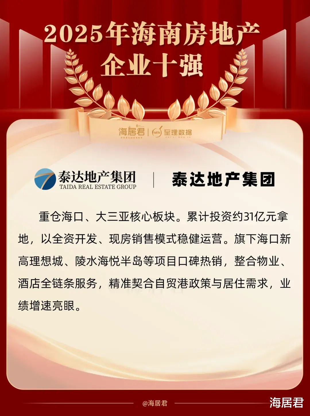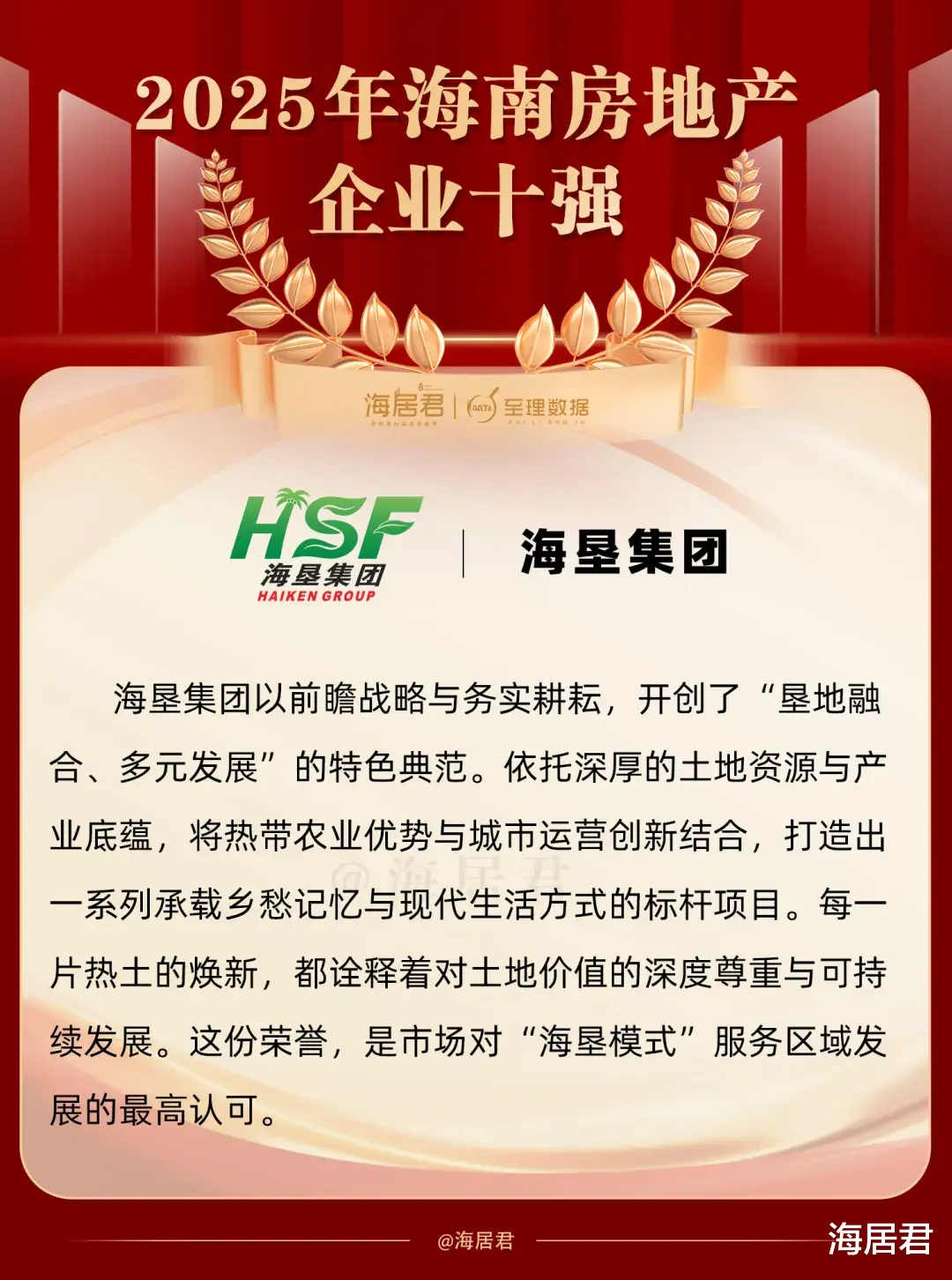 2026年伊始,海居君联合房地产专业研究机构至理数据评定2025年海南房地产企业十强,以此向行业树立一批打造“好房子”的标杆房企。