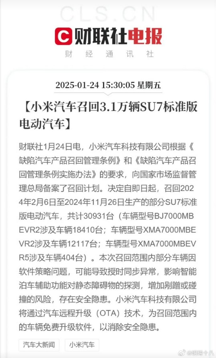 9月19日,国家市场监督管理总局发布重磅消息,多家知名车企宣布召回旗下部分车型,其中小米汽车科技有限公司决定自即日起,召回2024年2月6日至2025年8月30日生产的部分SU7标准版电动汽车,共计116,887辆。除小米外,广汽丰田、丰田中国、一汽丰田、斯巴鲁等车企也纷纷加入召回行列。这一集中召回事件,迅速引发了社会各界的广泛关注和热议。