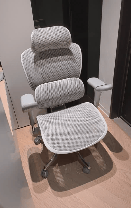 它的 4D 悬浮独立腰靠能动态贴合腰部,后仰时还能跟着身体动,减少腰部悬空。网布透气性不错,久坐不闷热,坐感偏硬实,支撑性强,但坐垫偏硬,久坐臀部容易酸胀,不适合喜欢软坐感的人。