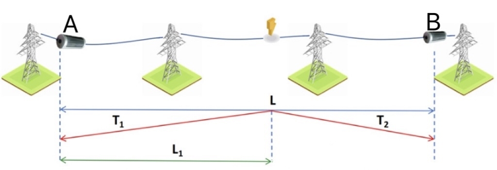当线路发生故障时,故障点会同时产生两个方向的行波:一个向线路的 A 端变电站传播,另一个向 B 端变电站传播。在 A 端和 B 端的监测设备(通常是故障录波器或专用行波测距装置),会分别记录下 “接收到故障行波的时间”,我们把这两个时间分别称为 T1和 T2。