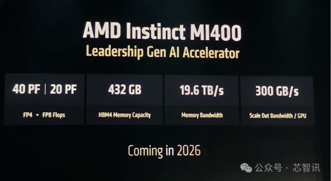 根据AMD在今年6月公布的信息显示,其即将于2026年推出下一代的MI400系列加速器,将基于2nm制程,集成432GB的HBM4内存,内存带宽将达19.6TB/s,单个GPU的横向扩展带宽也将高达300GB/s,而MI400 GPU的算力将高达FP4数据格式下40PFLOPS、FP8格式下20PFLOPS。AMD董事会主席兼首席执行官苏姿丰当时表示,“MI400系列真正汇集了我们在硅、软件和系统方面学到的一切,以交付一个完全集成AI的平台,这是从头开始构建的。这也使得MI400的AI计算能力相比MI355X系列高出2倍,HBM4带宽增加近2.5 倍,推理性能增加10倍。”