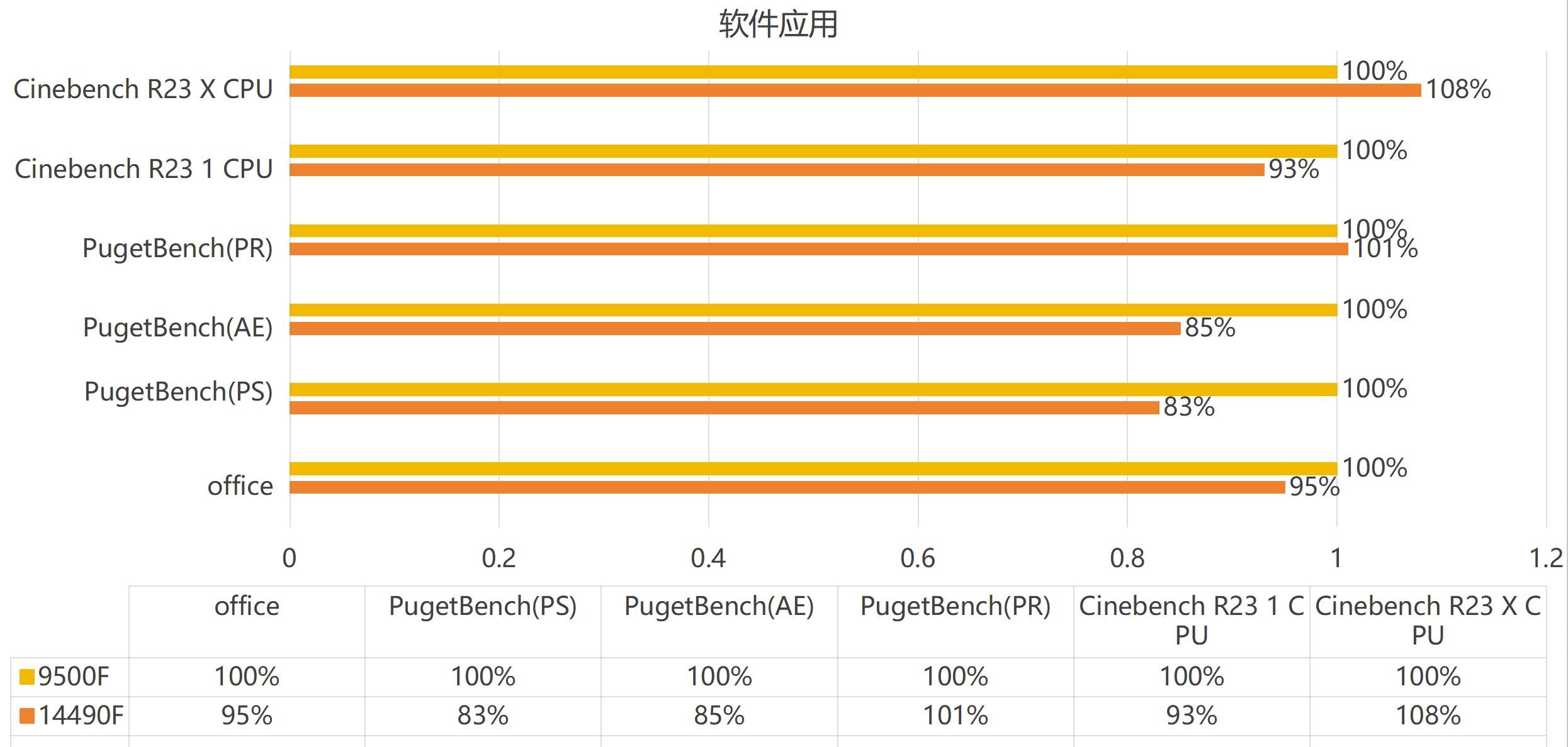 游戏测试完毕,我们再来看看它们在生产力上的表现,同样以9500F为基准,分别看看两款CPU在办公office软件、PS、AE、PR图像及视频编辑,同时还进行单核和多核的跑分对比。