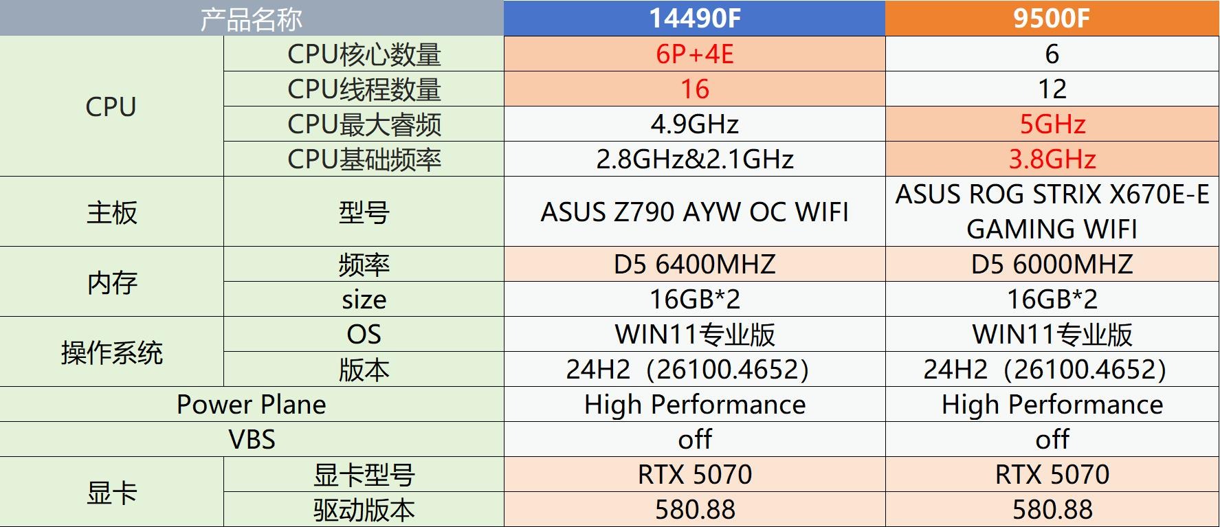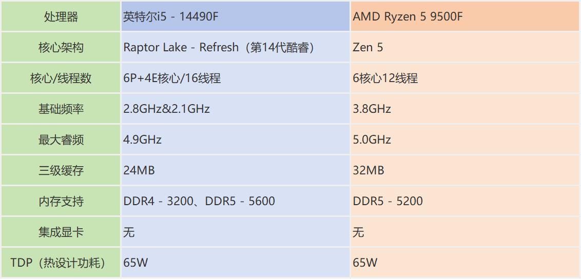 在桌面CPU领域英特尔和AMD都是无敌的存在,两者的“爱恨情仇”一直持续至今,在CPU“战场”的厮杀总是有来有回,你方唱罢我登场。CPU产品在不同的定位上一直针锋相对互相对标,这不英特尔争对普通玩家发布的中国特供小黑盒i5-14490F,上市以来以其优异性能和均衡表现得到广大玩家的一致好评,AMD则不甘示弱,其Ryzen 5 9500F在定位上可以说就是对标i5-14490F,两者在参数上各有胜负甚至参数还非常接近,售价上目前14490基本在千元以内,9500F的售价在1299元左右,价格上相差还是挺大的,而作为普通玩家的我们应该如何做出正确的抉择呢?