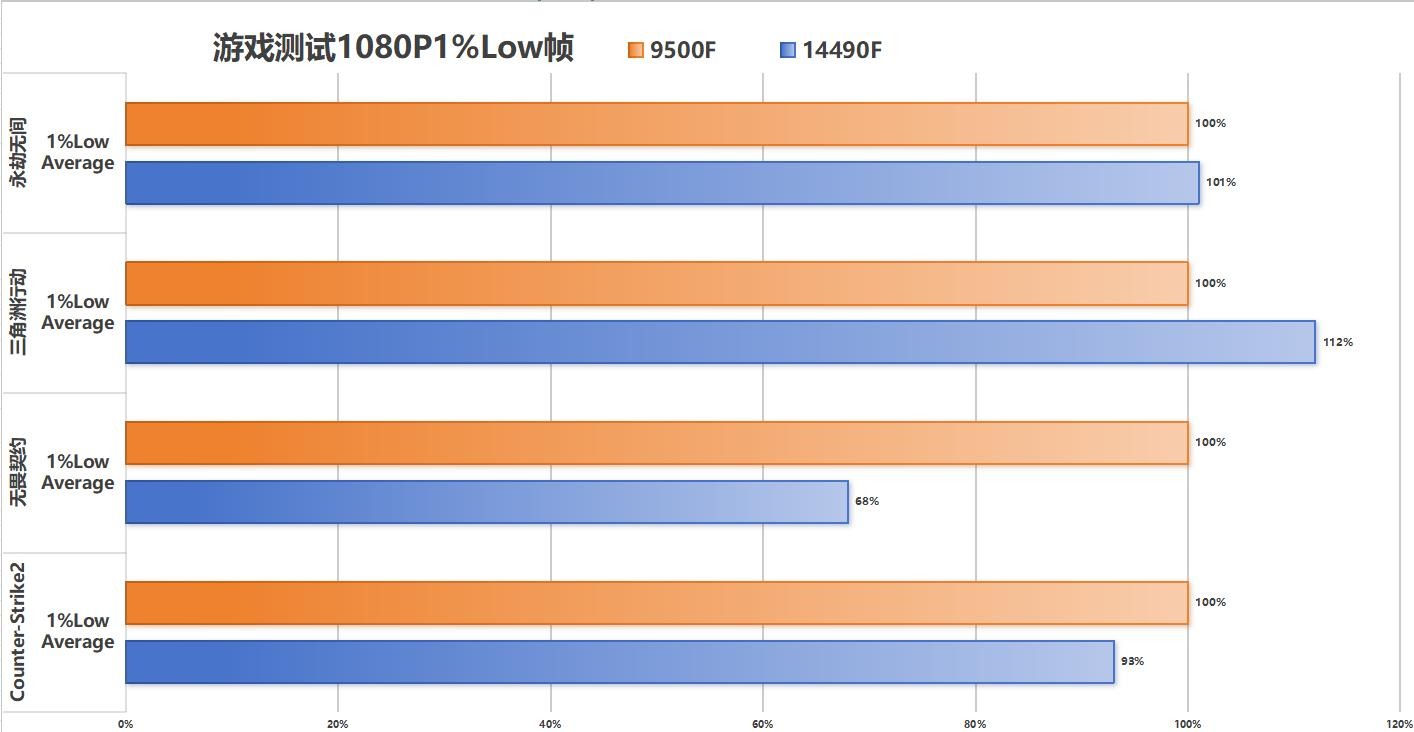 以上1%Low帧数据,14490F在永劫无间反转稍微领先1个百分点,三角洲行动依然稳定表现,而无畏契约和CS中反而还有所下降。从数据上看个人理解是新旧游戏之间适配差异,14490F明显在新游戏中表现优异,而9500F则在老游戏中发挥良好。