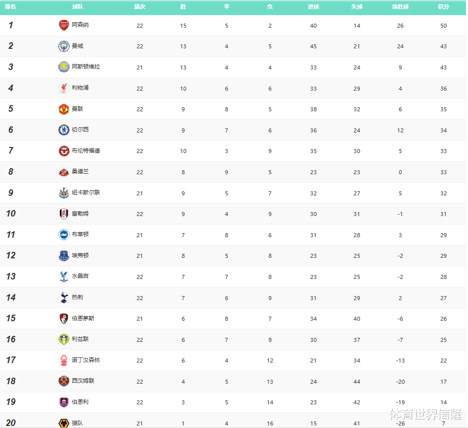 英超联赛第22轮激战7场,积分榜前4的球队中出战的3队均未能获胜,还没有出战的维拉看到反超曼城占据第二并且威胁到阿森纳榜首地位的机会,不过就目前形势来看,阿森纳的地位还是比较稳固的。