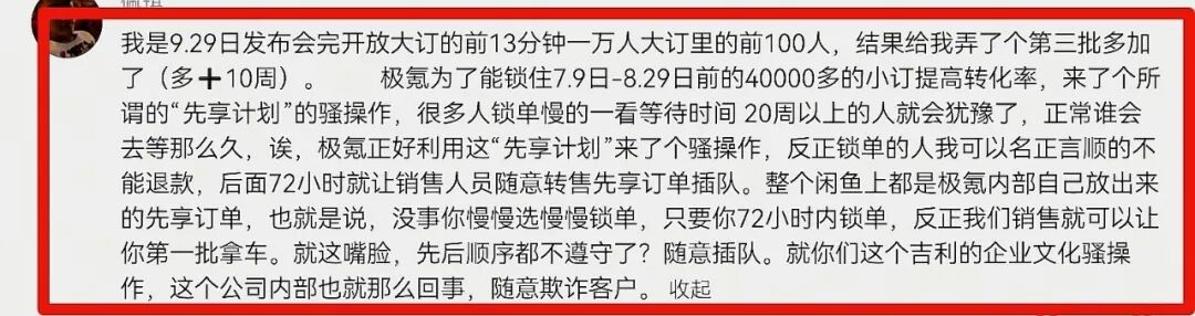 其一,锁单时销售明确表示等车时间是9-11周,现在延期后岂不意味着极氪违约,那至少得站出来给他们一个说法。