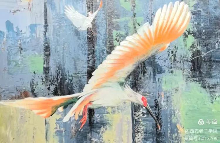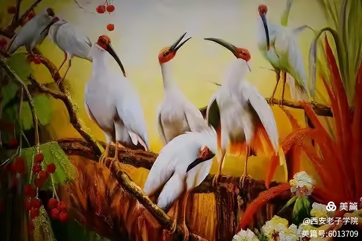 晏子的朱鹮油画作品将整体审美和局部审美有机融合,把中国工笔画和西方油画技巧自然融汇,将朱鹦与大自然用造型、色彩、光影真实再现。背景的四季轮替、朱鹮从幼雏到羽翼丰满、护鹮人的身影、人类与朱鹮和谐共处的场景等,一一展现在观众面前。