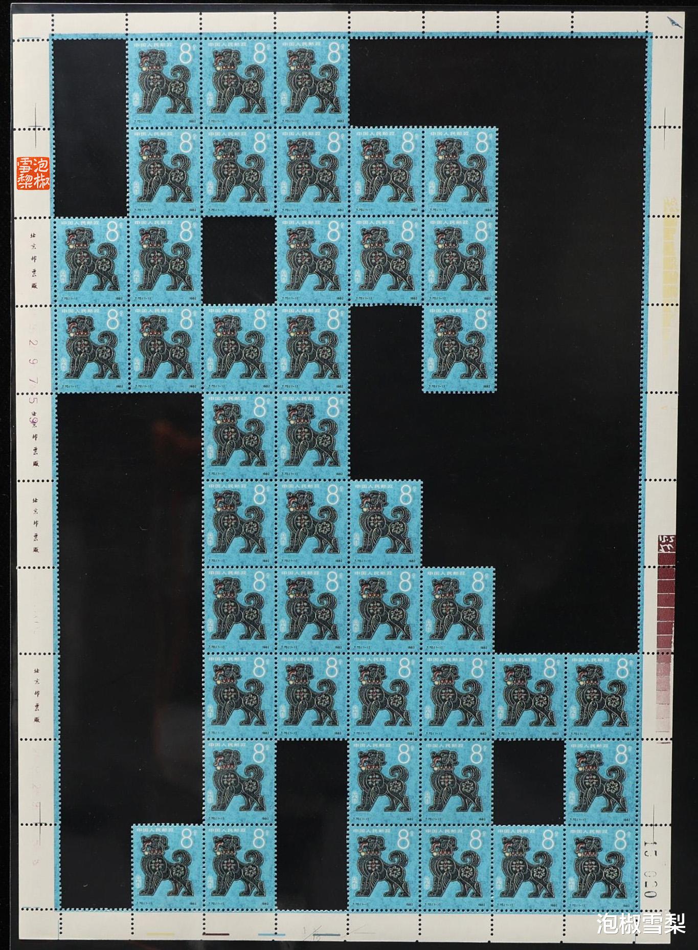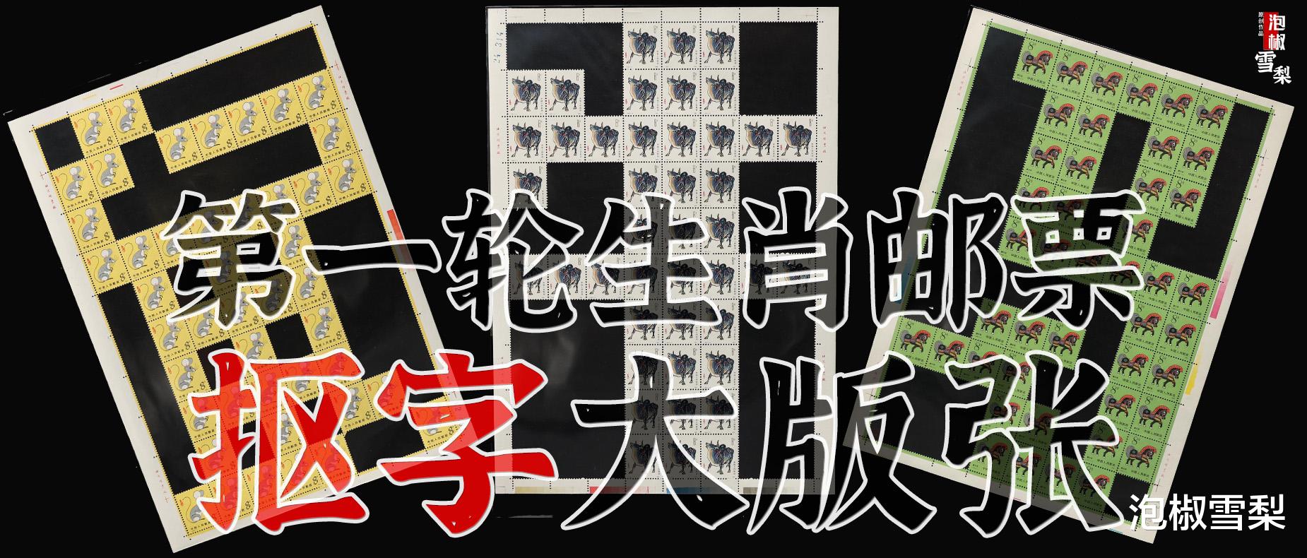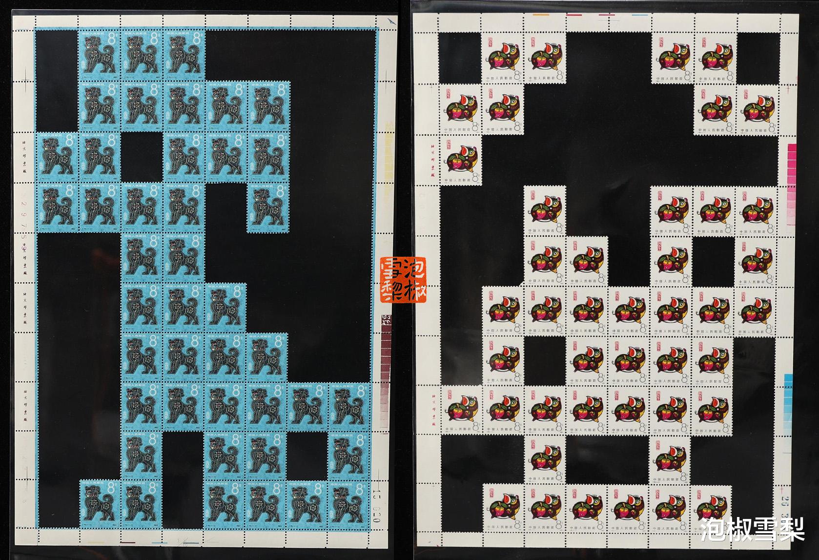 以上就是第一轮生肖邮票的12版抠字大版张,其中部分生肖因为汉字笔画较多,所以采用了动物形象作为图案,比如生肖狗,而猪的形象就更加抽象了,若不是有其它邮票作为参考,几乎看不出猪版想要表达什么。