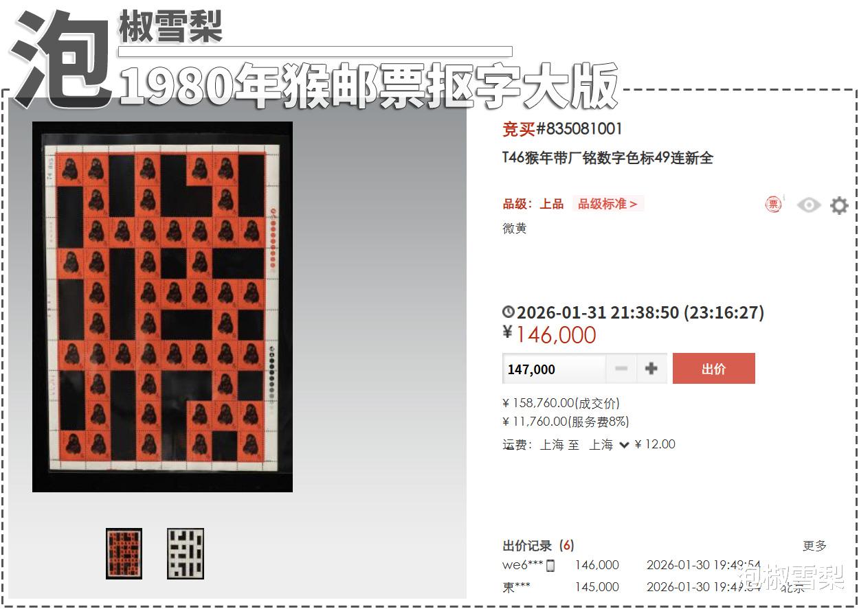 猴票抠字大版并非孤立,2026年1月26日某平台就拍卖了一组第一轮生肖邮票除猴外的11版抠字大版,品相为上品,最终的成交价格为4752元,对比完整版的价格,全套抠字版甚至还不如单独一版鸡邮票的价格,所以这种后期加工过的邮票,更加倾向于趣味性,至于收藏价值和经济价值,那就是仁者见仁智者见智了。