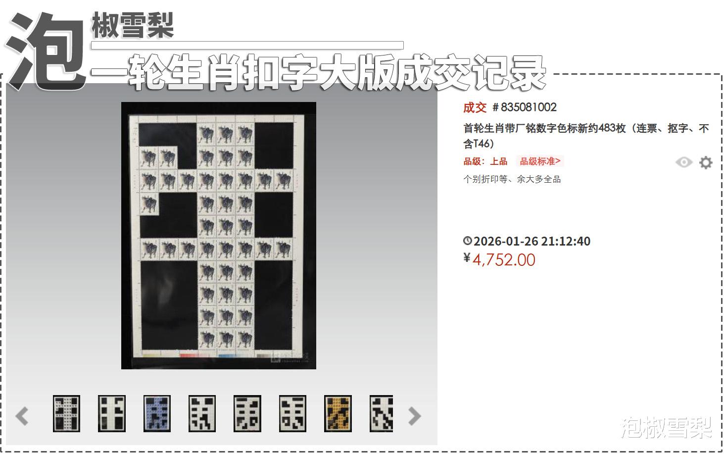 从成交的结果看,确实有人愿意为了这些字形图案买单,所以如果收藏者手中的整版邮票上,存在部分邮票品相很差的情况,也是可以通过抠字法来提高市场价值的,至于这种“玩法”算不算集邮,只要买卖双方愿意,旁人说什么也没必要在意。