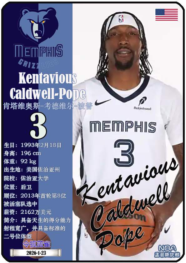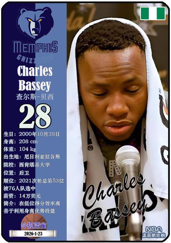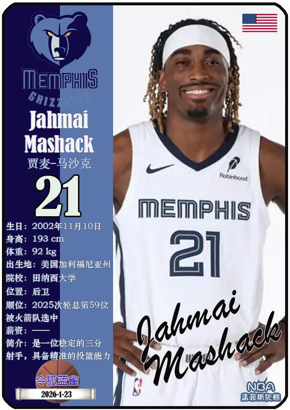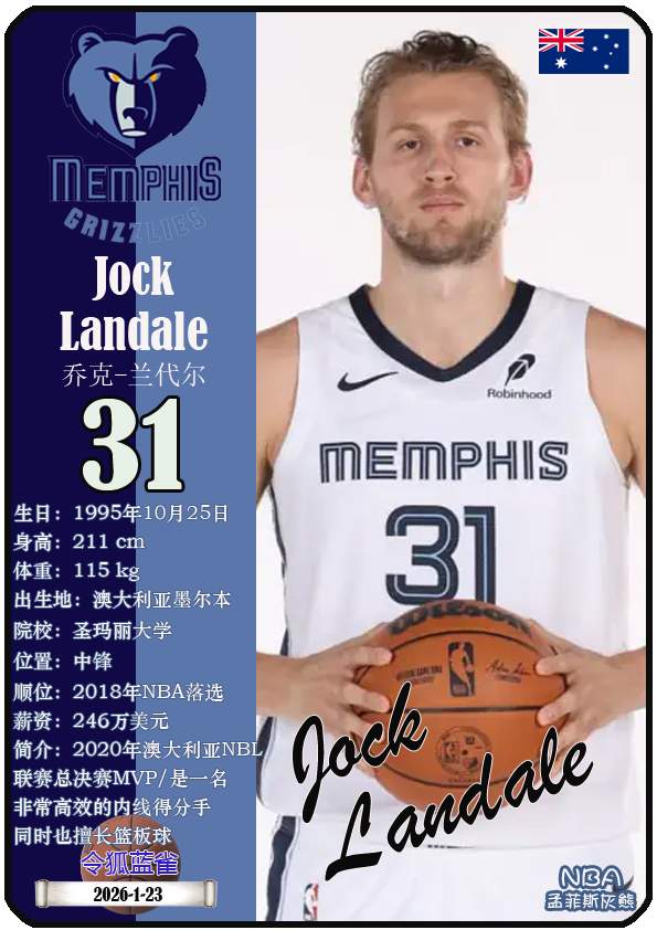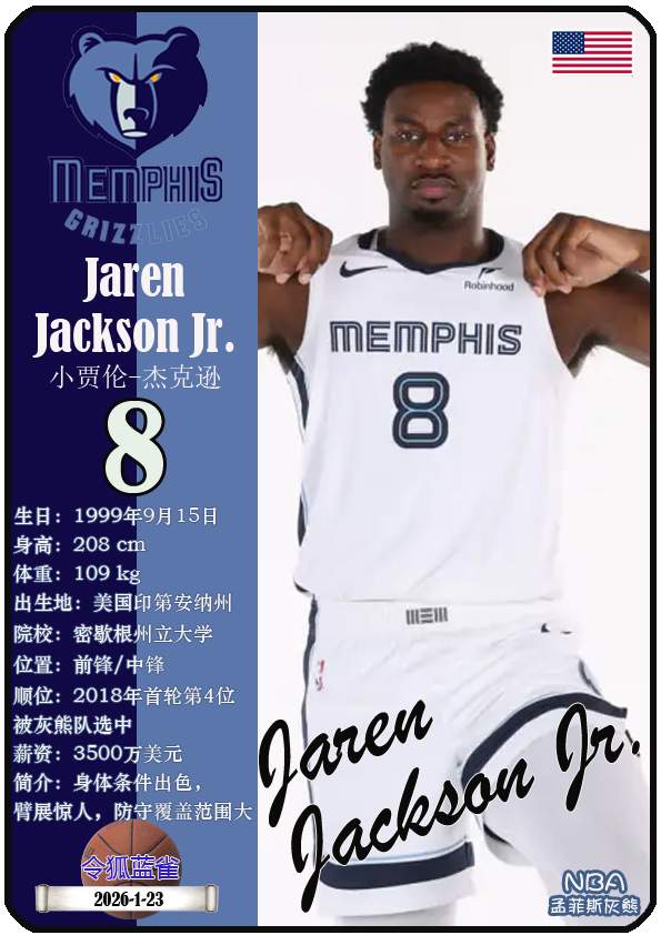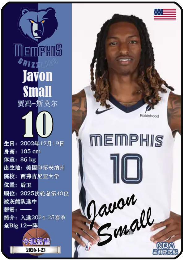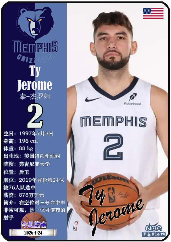 NBA孟菲斯灰熊队于1995年加入NBA,距今已有31年历史。截至2026年1月24日,球队主教练是图奥马斯·伊萨洛,队内拥有球员贾-莫兰特、贾-莫兰特、锡德里克-科沃德等。本期以球星卡的形式展示目前NBA孟菲斯灰熊队的19名球员(按球衣号码排序):