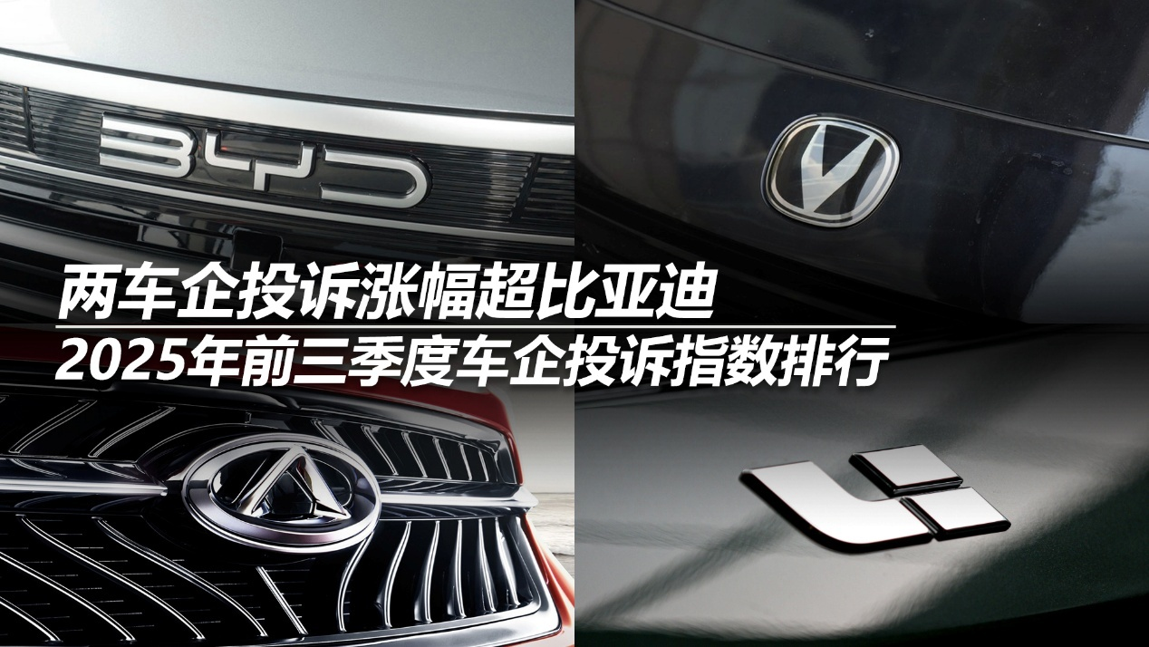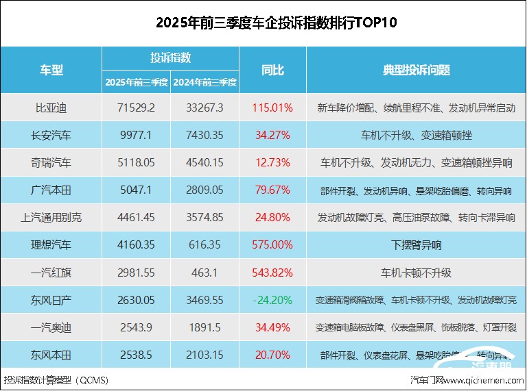 数据显示,2025年前三季度车企整体投诉指数为163069.85,同比上涨39%。整体来看,除东风日产外,上榜的其余9家车企投诉指数均呈上涨态势。其中,理想汽车和一汽红旗投诉指数均涨超5倍,前者因下摆臂异响遭到了车主的集中投诉,而后者因卡顿不升级引起车主不满。比亚迪投诉指数同比上涨115.01%,新车降价增配、续航里程不准、发动机异常启动等是今年前三季度最严重的问题。长安汽车、奇瑞汽车、广汽本田、上汽通用别克、一汽奥迪、东风本田则呈2位数的同比涨幅,问题主要集中在车机、变速箱、发动机等问题上。