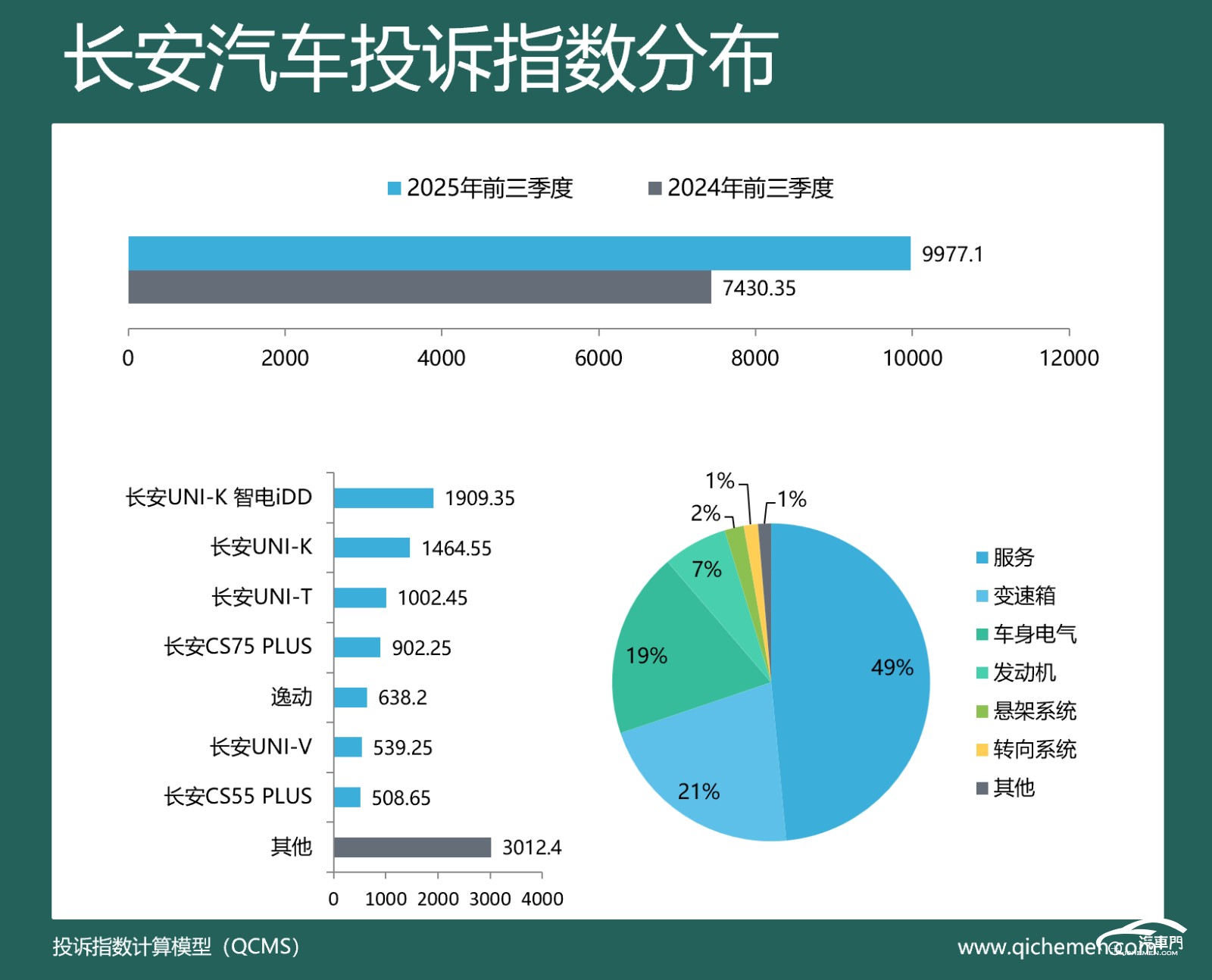 汽车质量投诉点评:前三季度,长安汽车的投诉指数同比上涨了34.27%,车机不升级和变速箱顿挫的问题依旧难解。从投诉反馈来看,车机不升级问题主要集中在长安UNI系列、长安CS75 PLUS、锐程PLUS等。多位车主反映称,长安汽车曾承诺在2025年4月会陆续推送车机系统更新,但实际却并未推送。面对车主们的投诉,长安客服表示车机更新日期已经延期,并且暂时没有具体的时间。变速箱顿挫也是长安汽车“老大难”问题,2022款长安UNI-K 智电iDD、2023款锐程PLUS、2023款长安X5 PLUS都是重点投诉车型。据了解,这些车型的变速箱问题或与使用了长安汽车自研的七档湿式双离合变速箱有关。