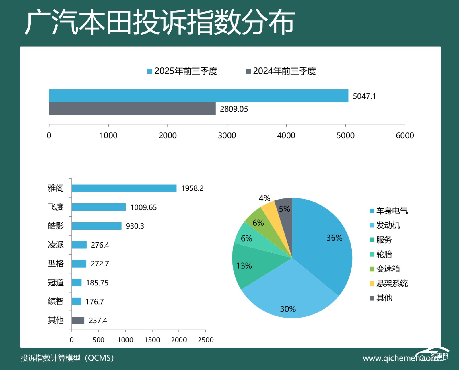 汽车质量投诉点评:广汽本田今年前三季度投诉指数达5047.1,同比上涨79.67%。车型投诉前三名中,雅阁因悬架吃胎偏磨登广汽本田车型投诉第一名,占整体投诉指数的39%。飞度因冷车启动发动机异响引发车主集体投诉,涉及2014款和2018款车型。皓影的问题主要集中在天窗遮阳帘卡扣断裂,2021款是重点投诉车型。事实上,这三个投诉问题由来已久。但因部分车型已超出质保期限,官方并未给出具体解决方案,相关维修费用需由车主自行承担,这也导致投诉始终未能平息。