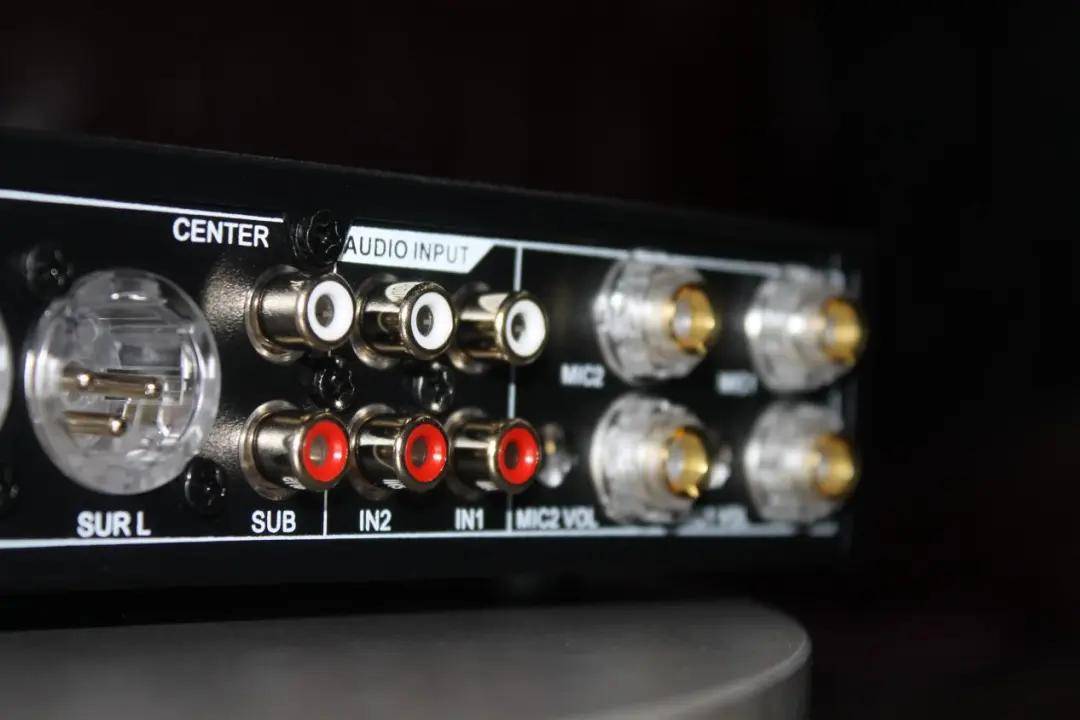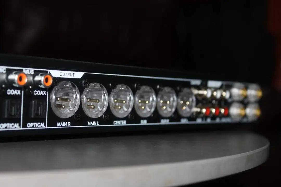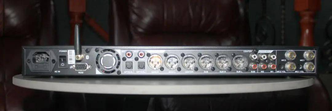 背面接口也很丰富,除了比较常见的5.1声道平衡输出接口,还有两个单独的中置和超低音输出RCA接口,接不带XLR接口的低音炮就方便多了(虽然K歌基本用不到低音炮)。