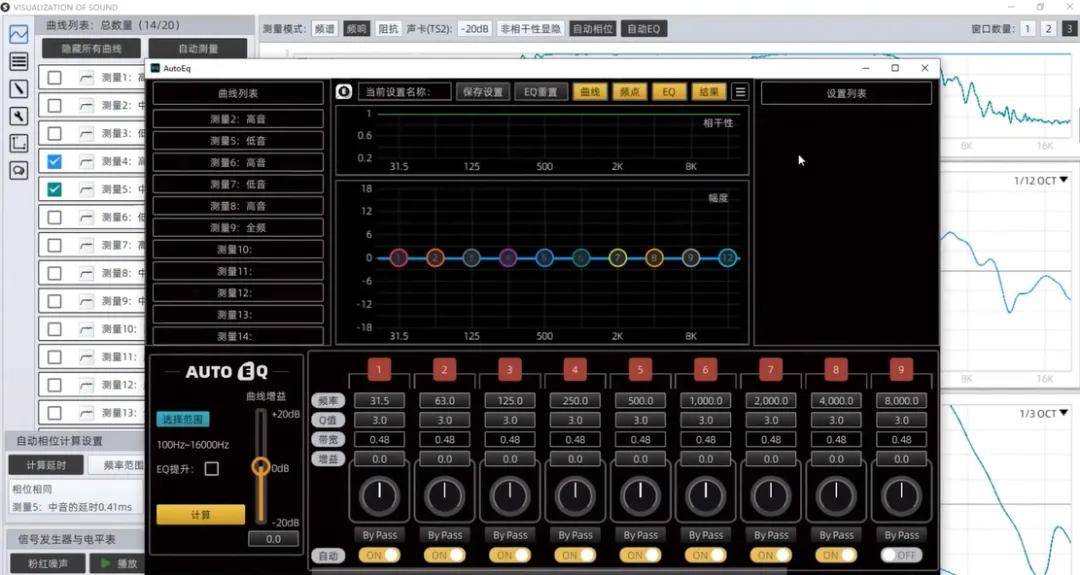 复制粘贴EQ数据可以很方便地导入其他声道的EQ数据,而导入VOS数据功能就厉害了,只要把专用声学分析仪的测量结果经过软件自动校正后,导入到中创T3对应的输出通道就好了,延时相位也可以使用VOS软件计算,相当于实现了半自动空间校正。