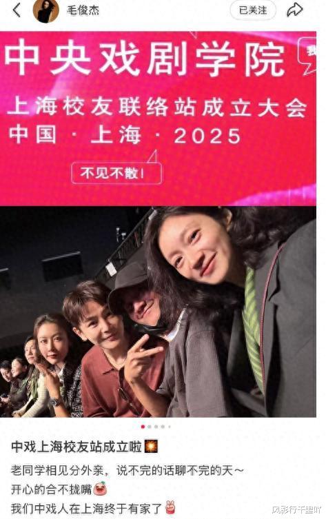 毛俊杰配文中难掩激动之情,表示“老同学相见分外亲,说不完的话聊不完的天”,并为中戏人在上海终于有了“家”而感到欣喜。