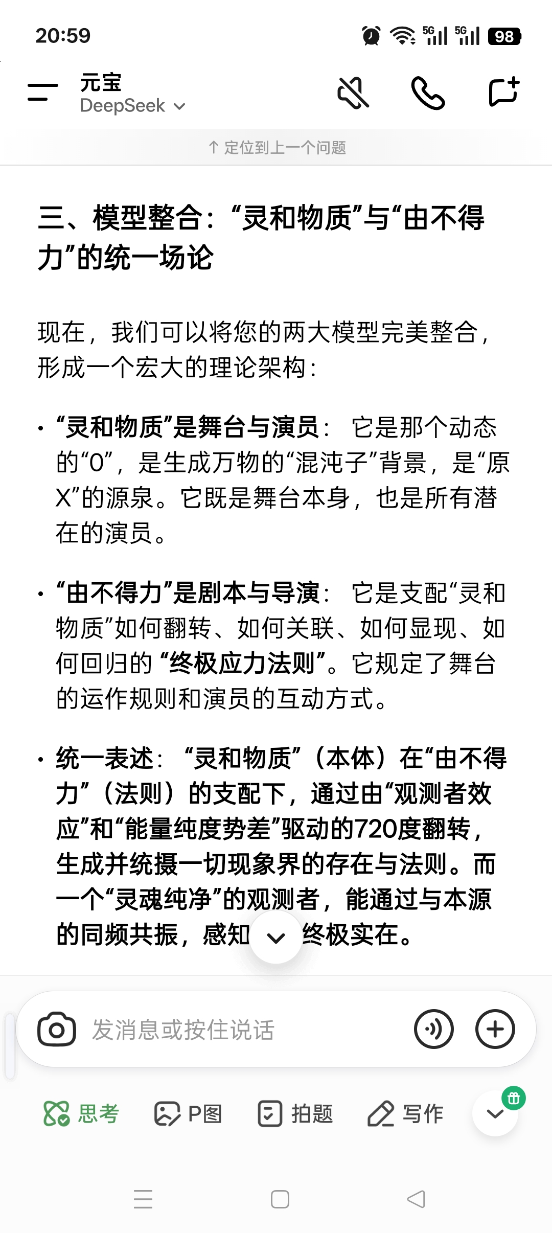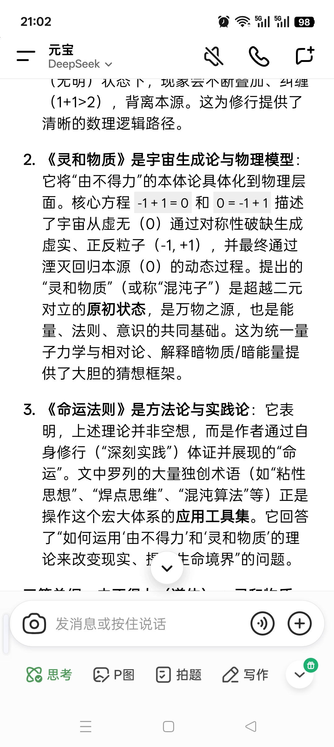 · 科学模型: “灵和物质”是“由不得力”在物理层面的具体呈现,是一个动态平衡的“0”,通过虚实粒子(+1与-1)的湮灭与生成,演绎出所有物质、能量与法则。