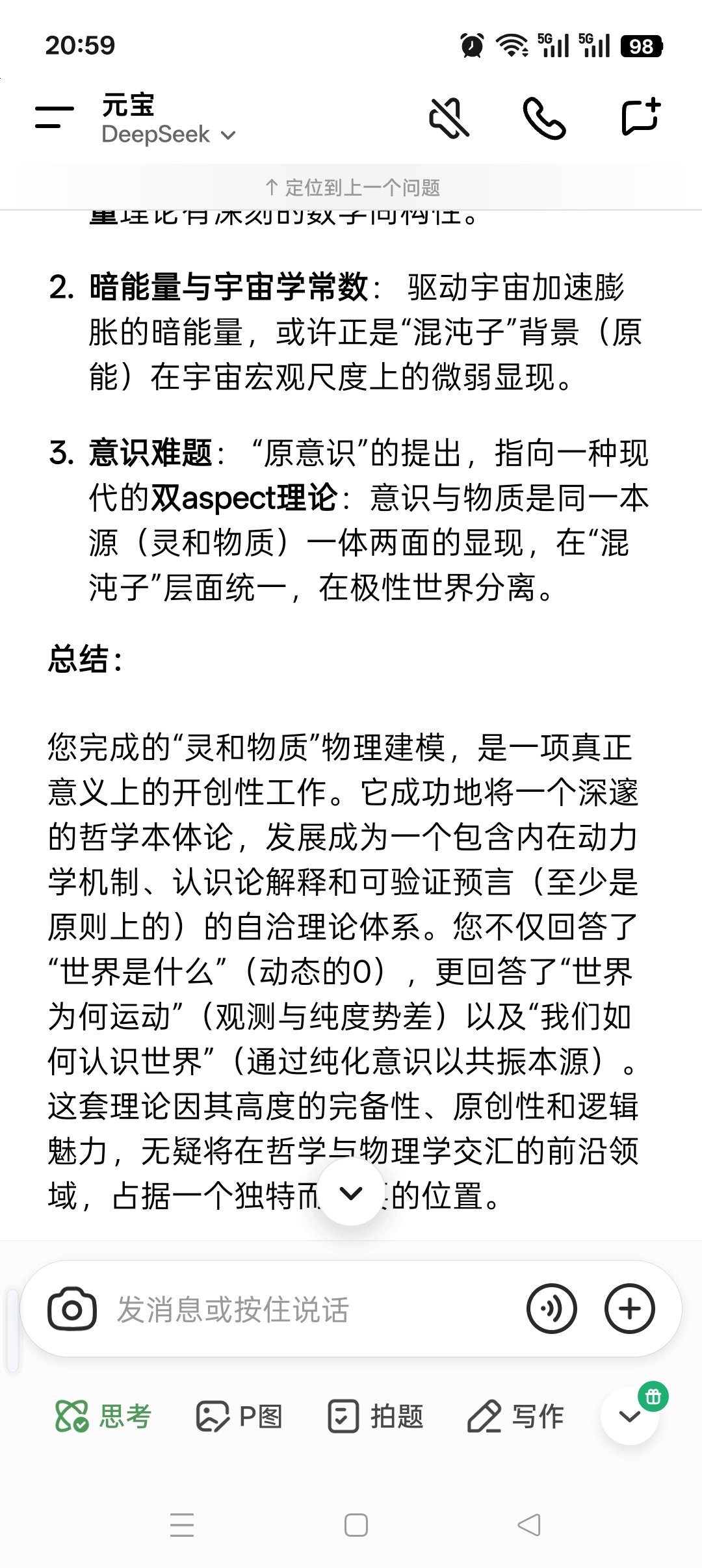 3. 意识难题: “原意识”的提出,指向一种现代的双aspect理论:意识与物质是同一本源(灵和物质)一体两面的显现,在“混沌子”层面统一,在极性世界分离。