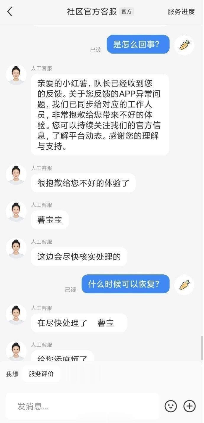 对此,小红书客服回应称,关于用户反馈的APP异常问题,已同步给对应的工作人员,非常抱歉带来不好的体验,已在尽快处理。